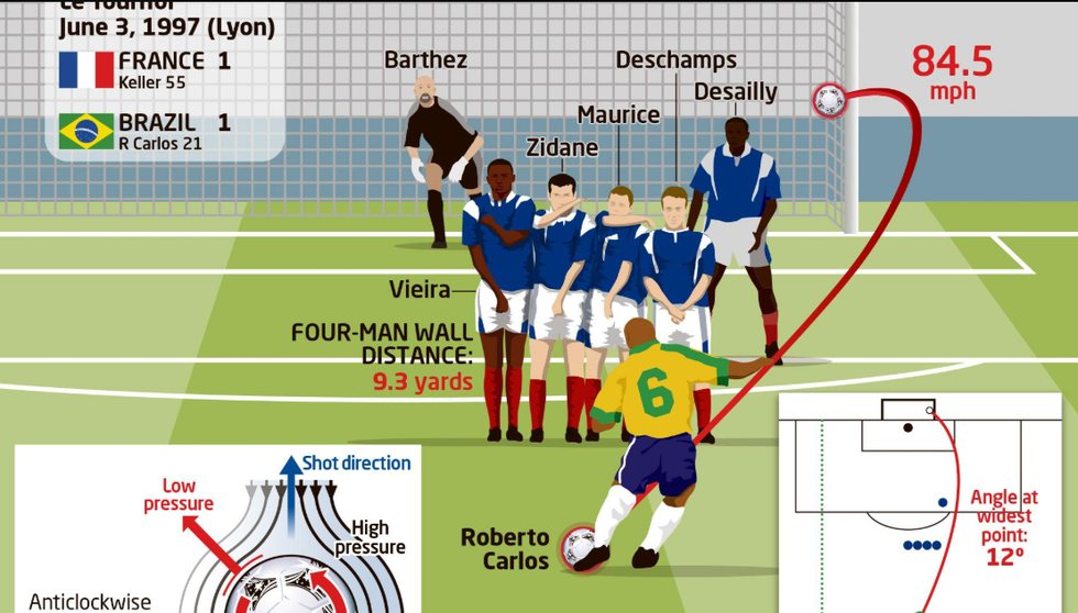 Carlos kishte përfituar nga kushtet e favorshme atmosferike dhe, falë efektit Magnus, topi ndryshoi trajektoren e tij deri në katër metra.