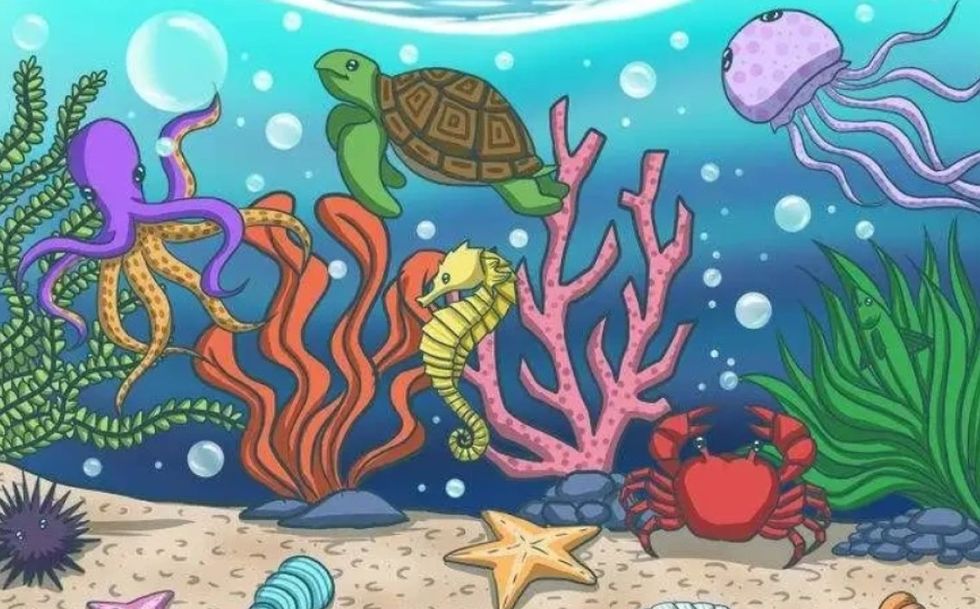 Në imazh fshihet një peshk mes breshkave, yjeve të detit dhe banorëve të tjerë të detit.