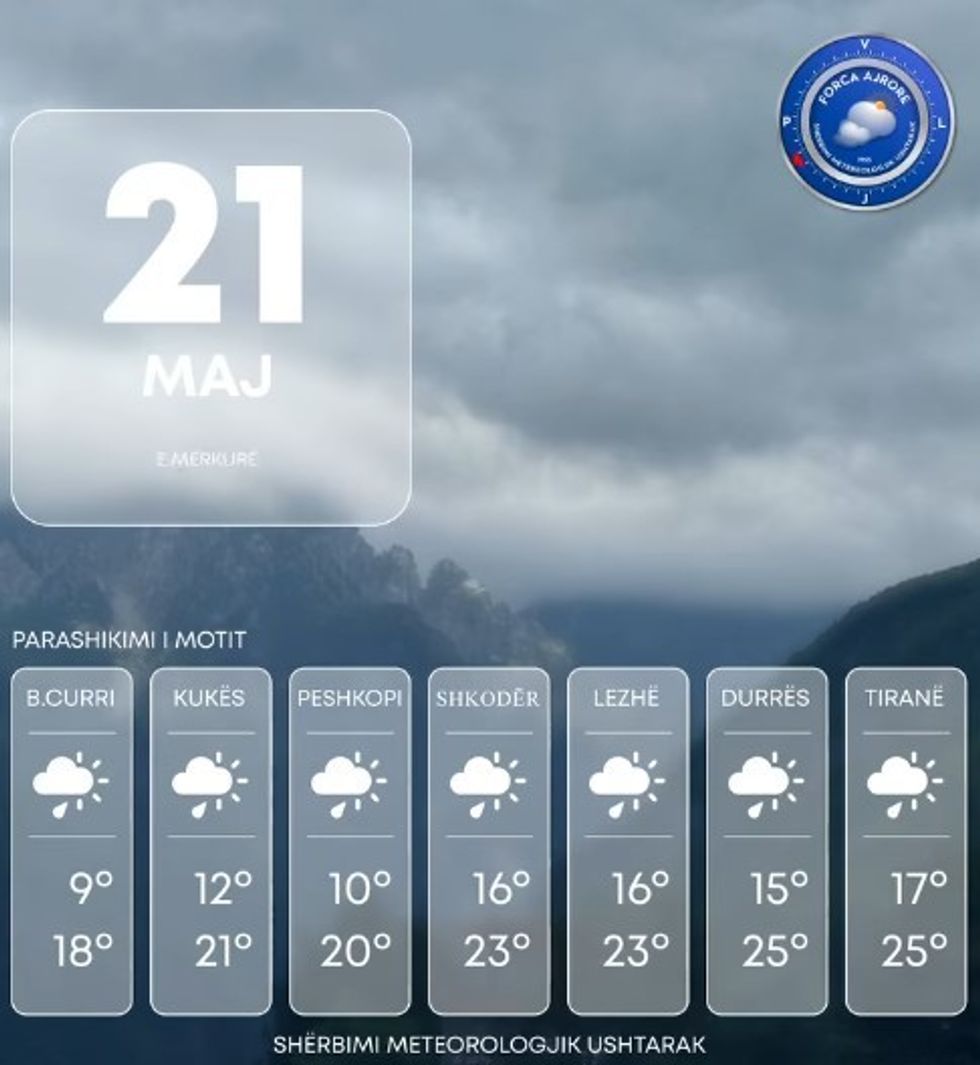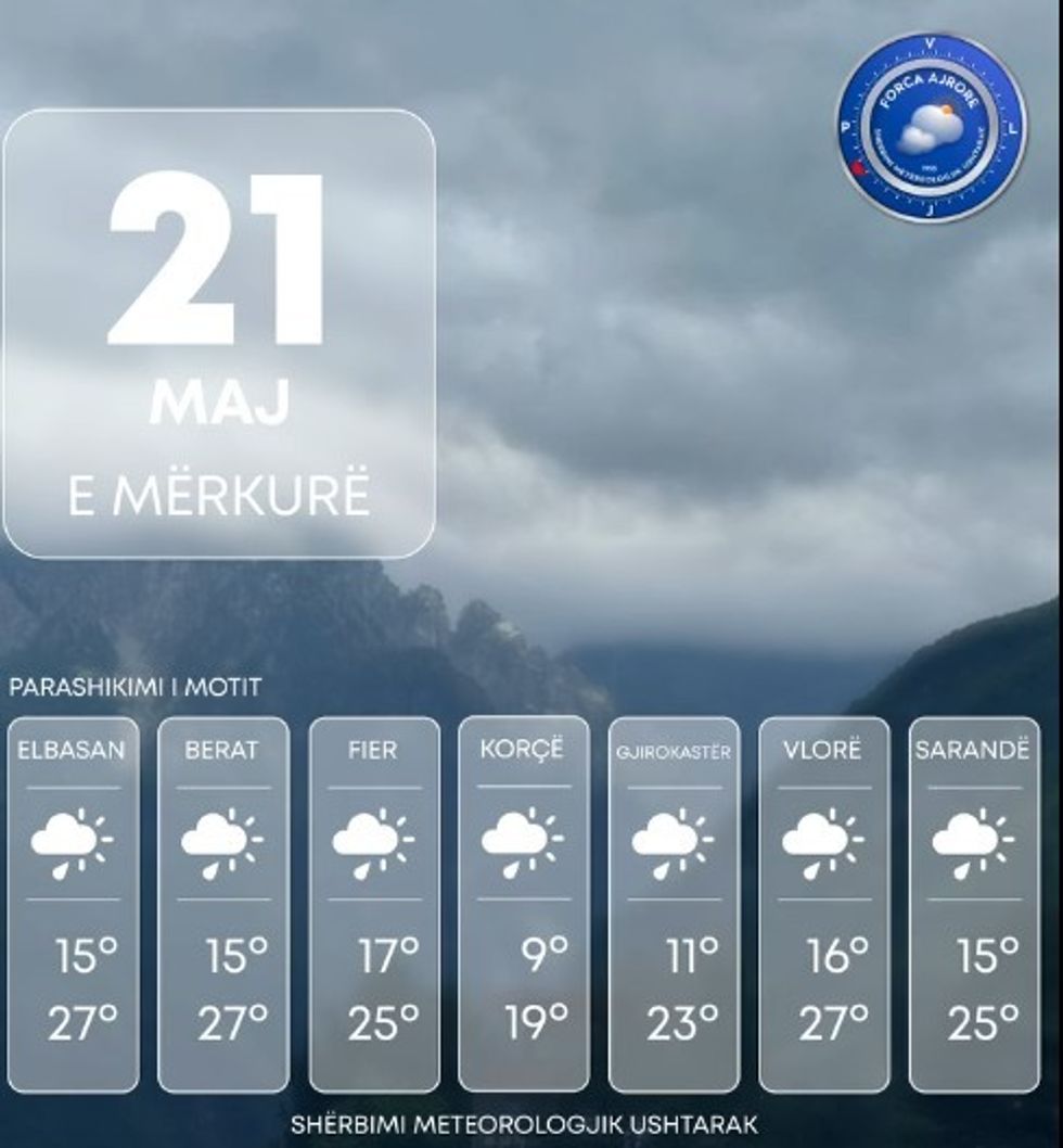 Shërbimi Meteorologjik Ushtarak bën të ditur se të mërkurën në Shqipëri do të ketë kushte atmosferike të paqëndrueshme.