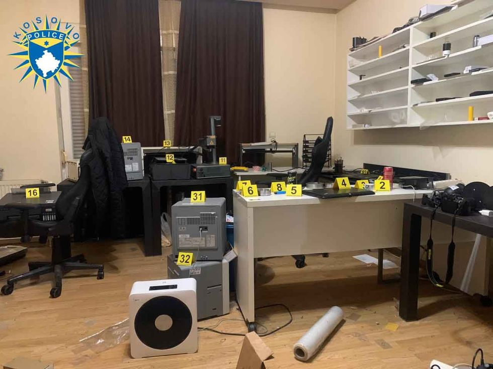 Tutje thuhet se “pas hetimeve të mëtejme, në të njëjtën ditë, në një shtëpi të dyshuar në lagjen Veternik të Prishtinës është zbuluar një laborator i pajisur me makina të ndryshme lazerike, printerë dhe pajisje të tjera që përdoren për prodhimin e dokumenteve të falsifikuara, si dhe dokumente blanko me kopertina të shteteve të ndryshme të Evropës dhe botës”.