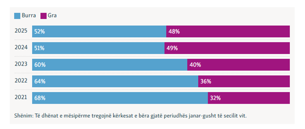 Edhe pse në të kaluarën kishte një numër dukshëm më të madh të burrave që kërkuan azil në BE, ky dallim pothuajse u zhduk në dy vjetët e fundit.