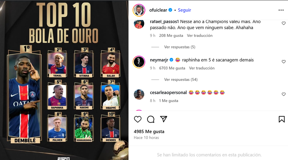 Pothuajse shok skuadre i Dembeles te Paris Saint-Germain, Neymar Junior (francezi mbërriti në klubin parizien menjëherë pasi u largua për në Al-Hilal në vitin 2023), futbollisti brazilian ka vënë në pikëpyetje renditjen përfundimtare të këtij edicioni të Topit të Artë.