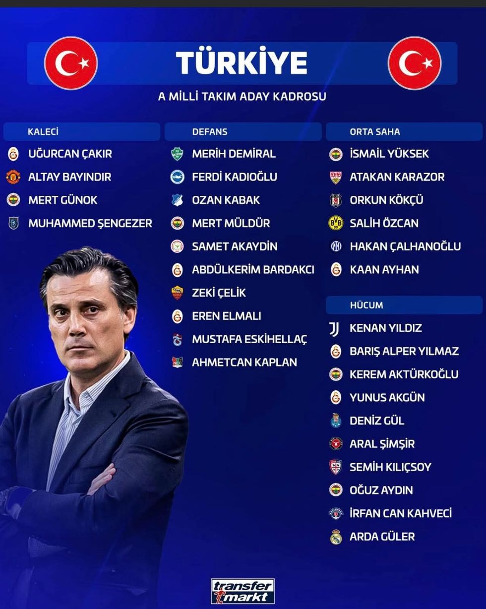 Përzgjedhësi Vincenzo Montella tashmë e ka bërë listën publike, ku ka shumë emra të njohur, përfshirë portierin Altay Bayindir të Manchester Unitedit, Hakan Calhanoglun e Interit, Kenan Yildizin e Juvensuti si dhe Arda Gulerin e Real Madridit.