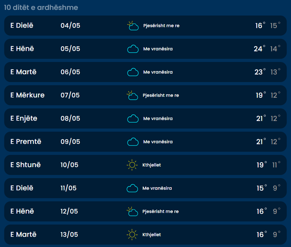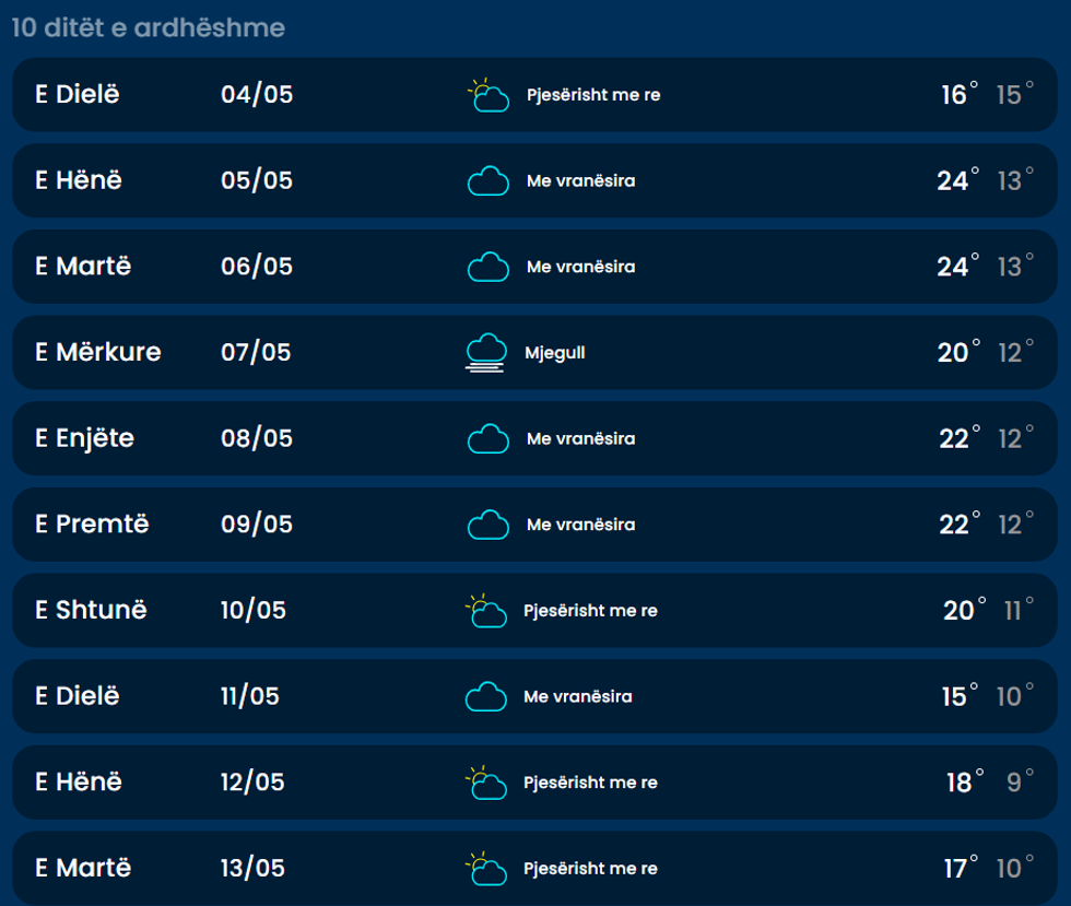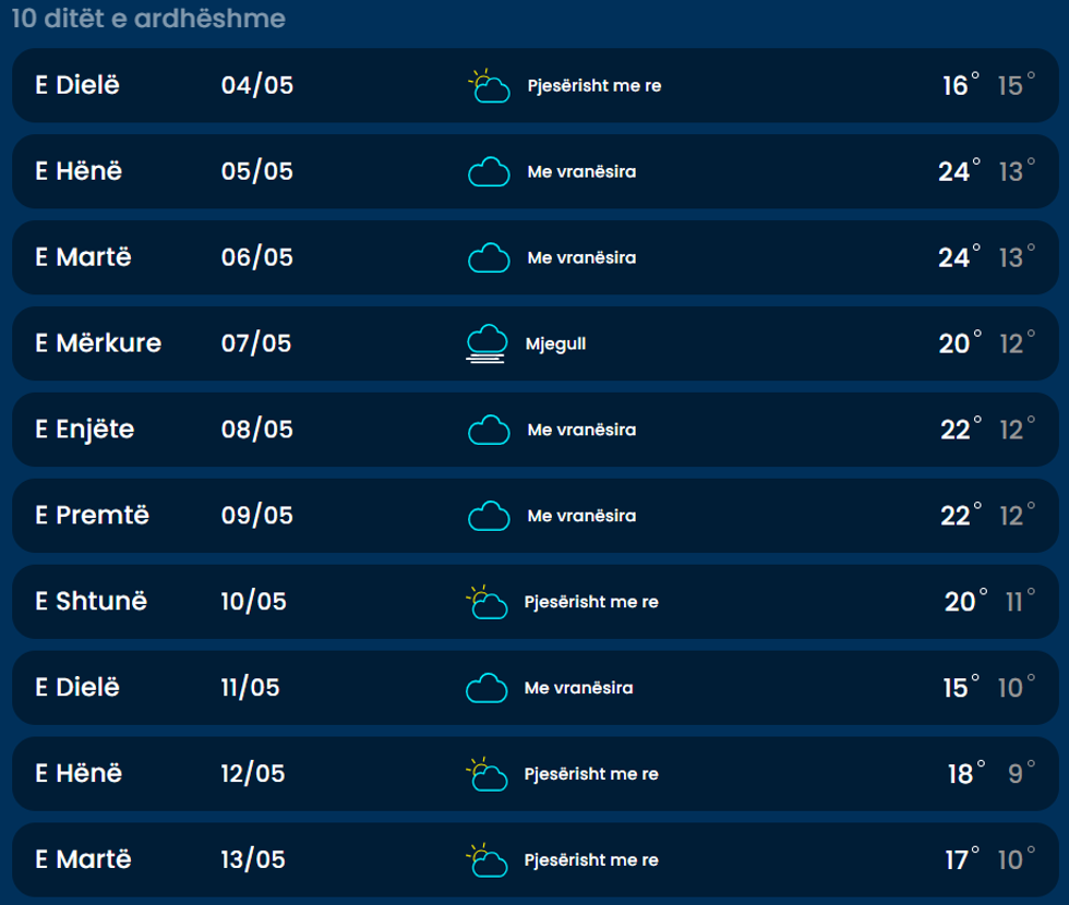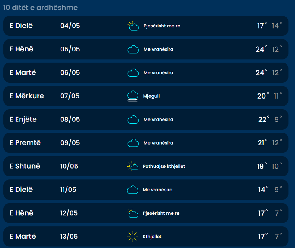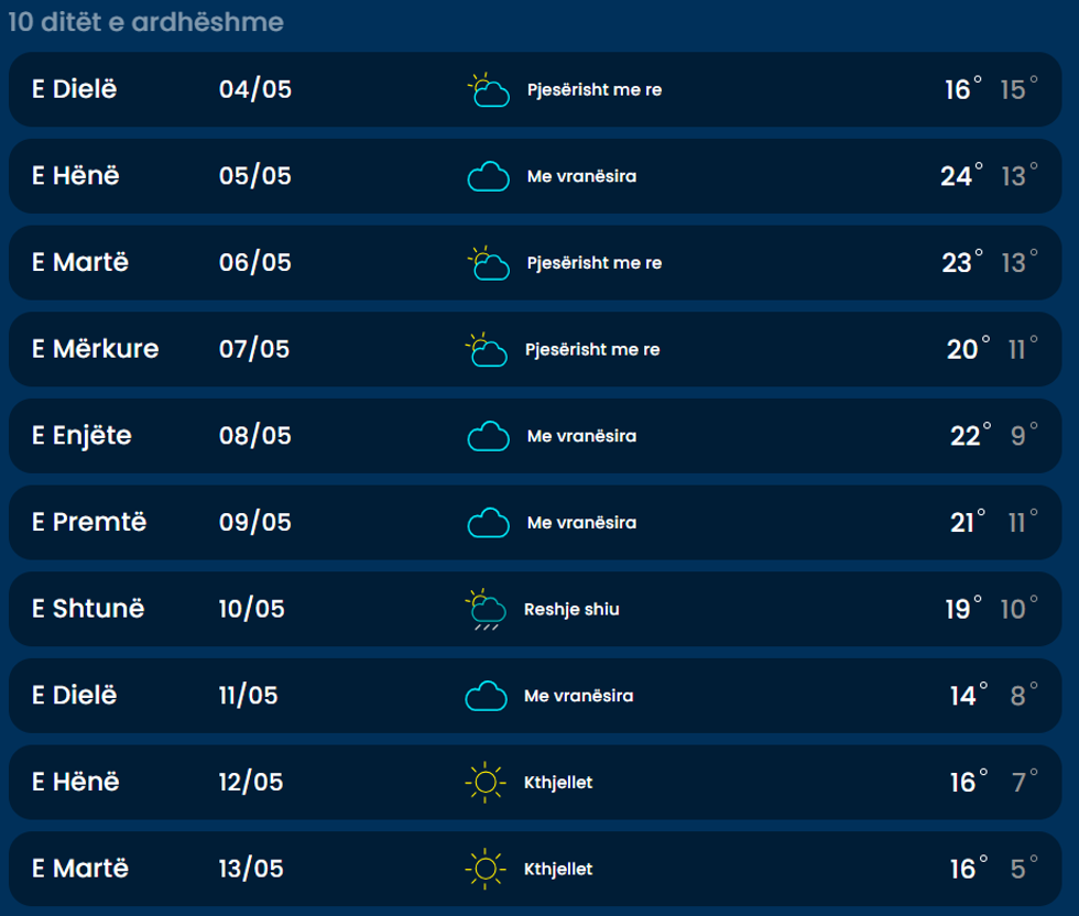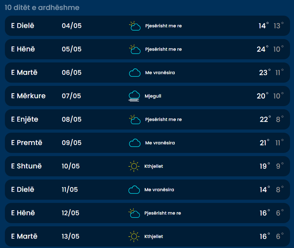 Parteshi do të ketë mot të butë dhe pjesërisht të vranët përgjatë kësaj periudhe, me temperatura që variojnë nga 18°C deri në 22°C. Reshje të shkurtra parashikohen rreth ditës së 7-të, ndërsa ditët e tjera mbeten kryesisht të thata dhe të përshtatshme për aktivitete në natyrë.