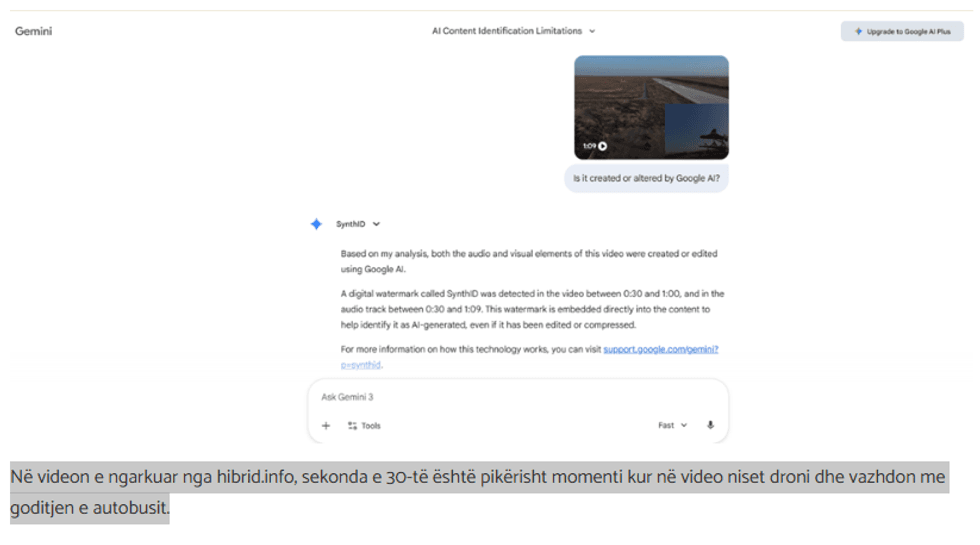 Për ta detektuar këtë, Google sugjeron që të pyetet “Gemini”. Hibrid.info e ka bërë pikërisht këtë. Fillimisht për shkak të kritereve të “Gemini” videoja është shkurtuar në 1:10, duke marrë pjesën e fundit, për shkak se “Hive Moderation” theksoi se përmbajtja e gjeneruar nga IA mund të jetë aty.