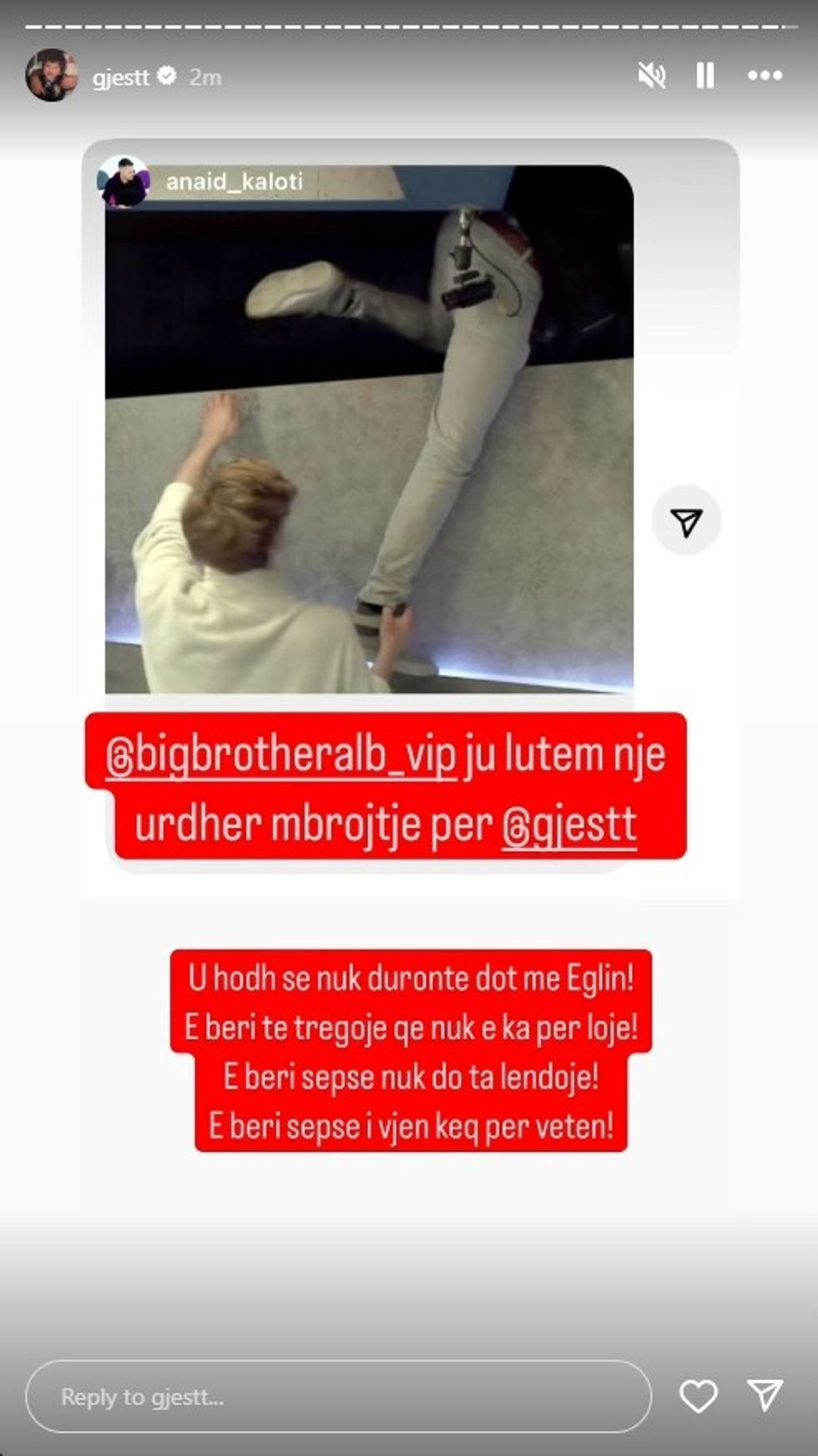 Në këtë postim, ai kërkoi "një urdhër mbrojtjeje për Gjestin", duke thënë se ai "u hodh se nuk duronte dot më Eglin" dhe se "e bëri të tregojë që nuk e ka për lojë". Ai gjithashtu theksoi se Gjesti veproi kështu sepse "nuk do ta lëndojë" dhe "i vjen keq për veten".