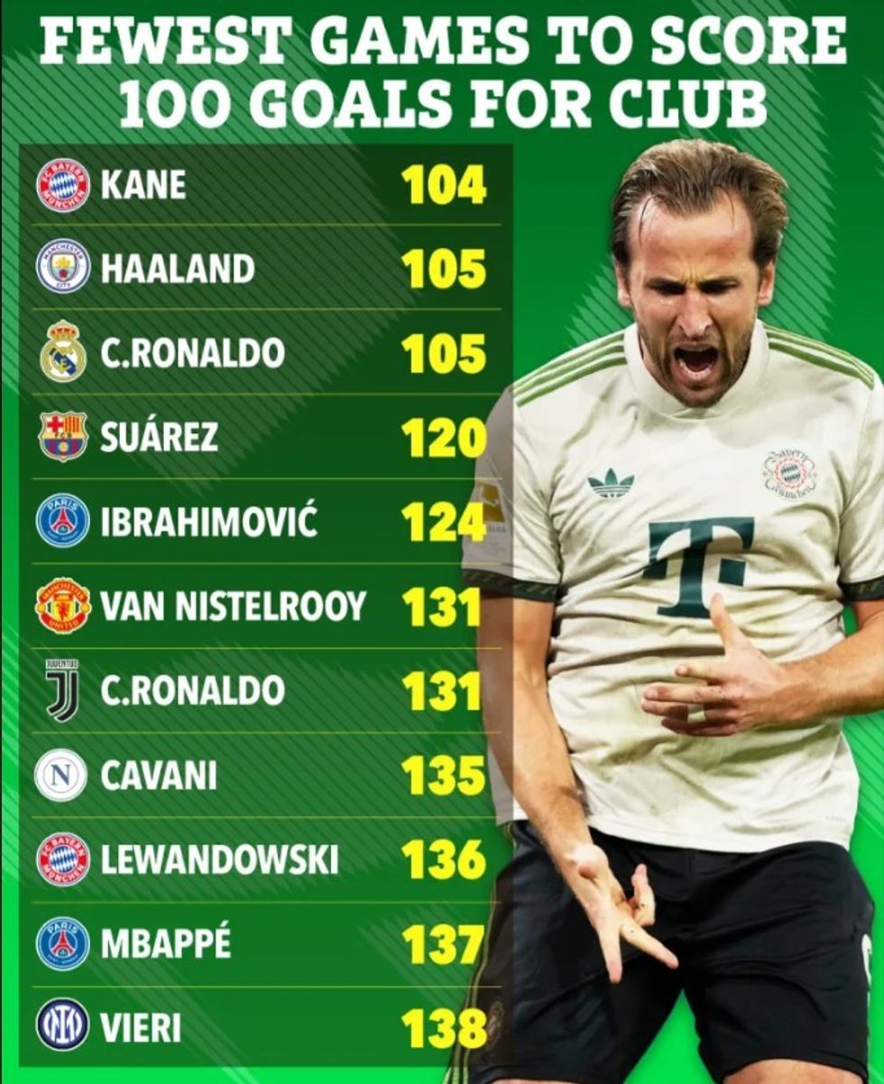 Edinson Cavanit iu deshën 135 ndeshje për 100 gola me Napolin, Robert Lewandowskit 136 ndeshje me Bayern Munichun, Kylian Mbappes 137 ndeshje me Paris Saint-Germain dhe Christian Vieri shënoi 100 gola për 138 ndeshje me Interin. /Telegrafi/