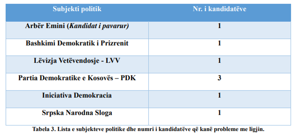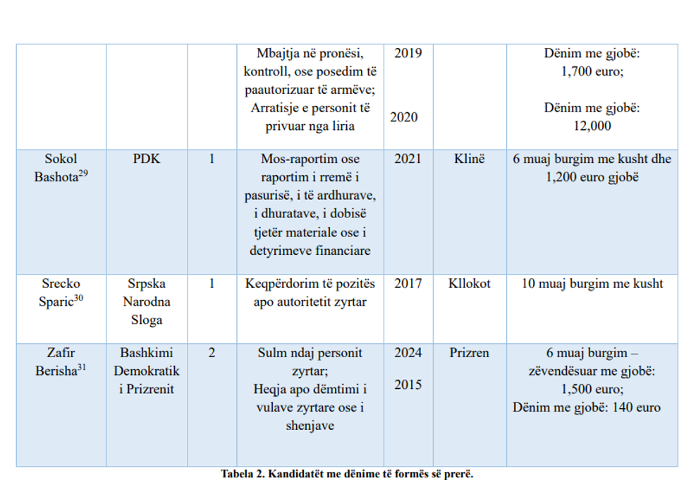 Sipas këtij raporti nga 206 kandidatët për kryetarë të komunave, 8 prej tyre apo 3.9% janë persona të cilët kanë probleme me ligjin.