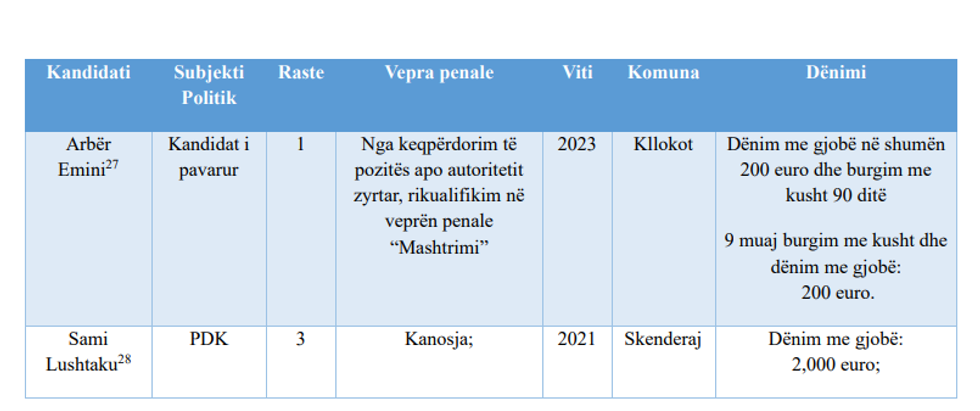 Raporti i IKD-së ka evidentuar edhe 5 kandidatë të cilët kanë pasur dënime penale të formës së prerë. Këta kandidatë janë: