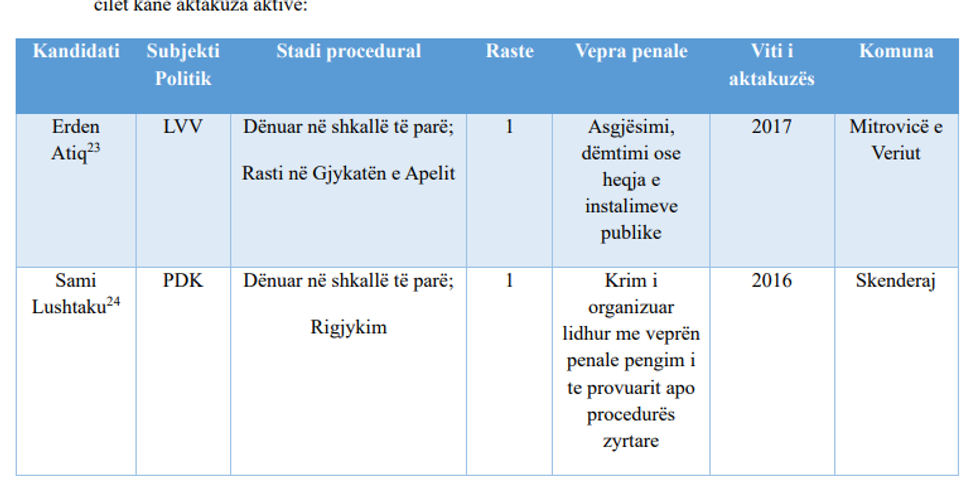 Sipas këtij raporti nga 206 kandidatët për kryetarë të komunave, 8 prej tyre apo 3.9% janë persona të cilët kanë probleme me ligjin.