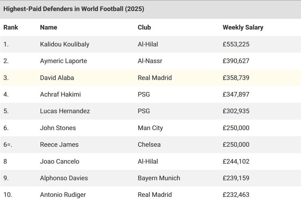 Në pozitën e parë renditet Kalidou Koulibay me një pagë prej 553,225 funte i ndjekur nga Aymeric Laporta me pagë 390,627 funte dhe David Alaba që kompleton podiumin me një pagë prej 358,739 funte.