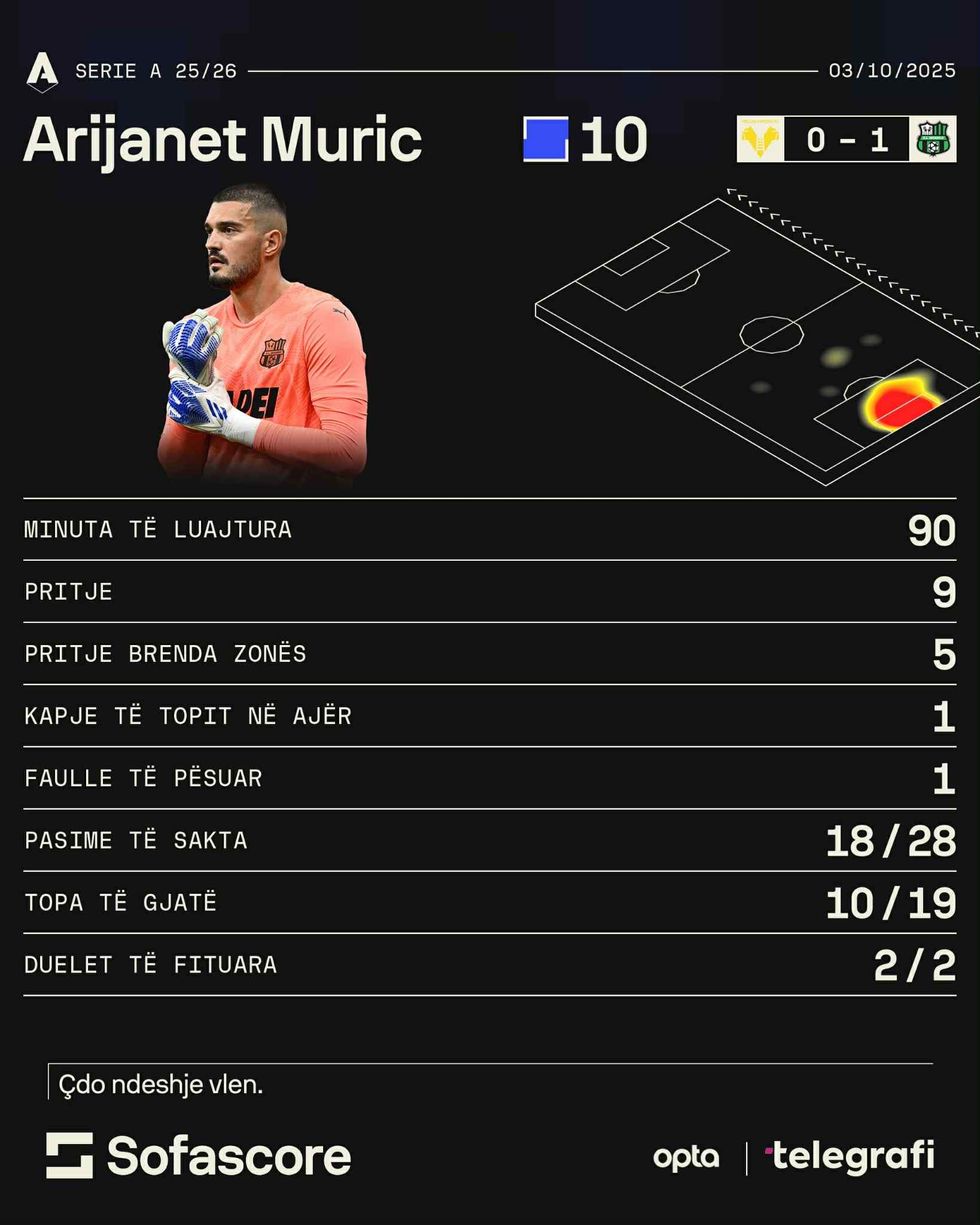 “Gardiani” i Sassuolos Aro Muric ishte më i miri, ku për herë të parë një portier arriti të marrë notën 10 në vlerësimet e “SofaScore”. Ai bëri plot nëntë pritje, ku pesë ishin brenda zonës.