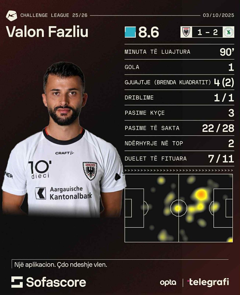 Paraqitje fantastike gjithashtu zhvilloi edhe sulmuesi Valon Fazliu, gjatë humbjes 1-2 nga Yverdon. Ai kishte katër goditje brenda zonës, dhuroi tre pasime kyçe si dhe shënoi golin e vetëm për Aaraun. Ndër të tjera, u vlerësua me notën 8.6.