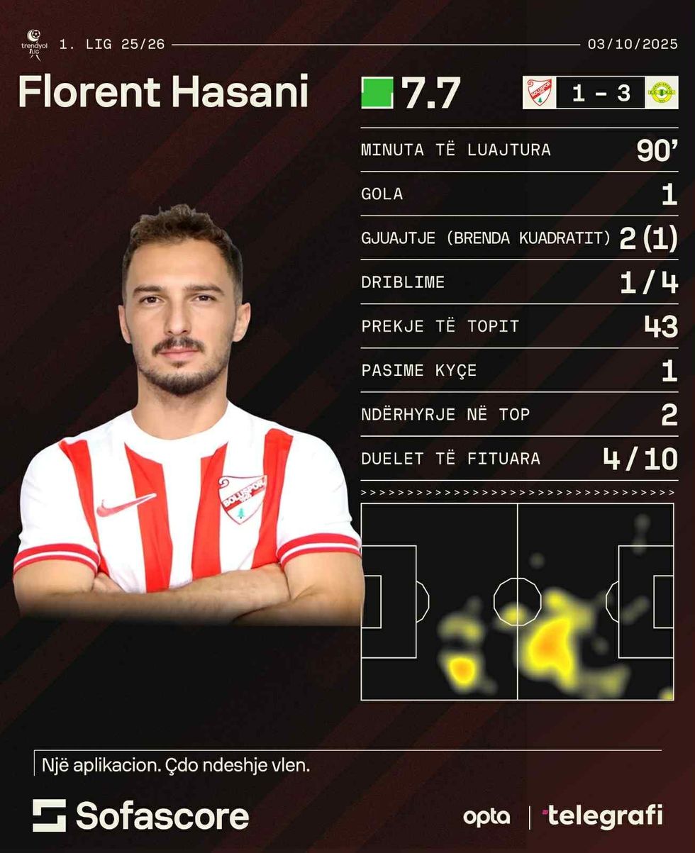I shkëlqyeshëm ishte edhe sulmuesi Florent Hasani, që realizoi golin e nderit në humbjen 1-3 kundër Erokspor në Ligën e Parë të Turqisë. 28-vjeçari u vlerësua me notën 7.7.