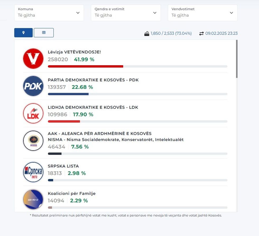 E përditësuar: Janë numëruar 73.04% për qind të votave dhe LVV është 41.99 për qind, PDK-22.68 për qind derisa LDK – 17.90 për qind të votave.