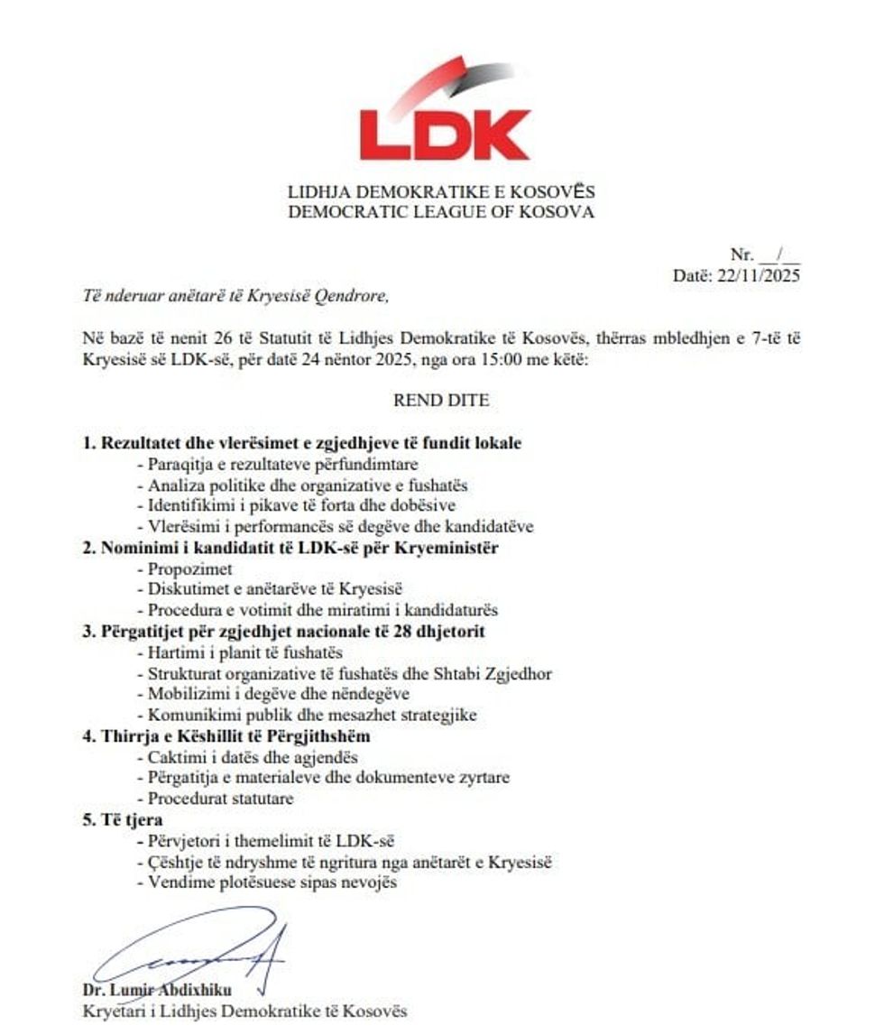 Ky zhvillim tregon se LDK po synon të hyjë në garën e 28 dhjetorit me strukturë të konsoliduar dhe me një figurë të qartë udhëheqëse, ndërsa skena politike pritet të dinamizohet edhe më shumë ditëve në vijim, teksa partitë finalizojnë koalicionet e mundshme dhe listat zgjedhore. /Telegrafi/