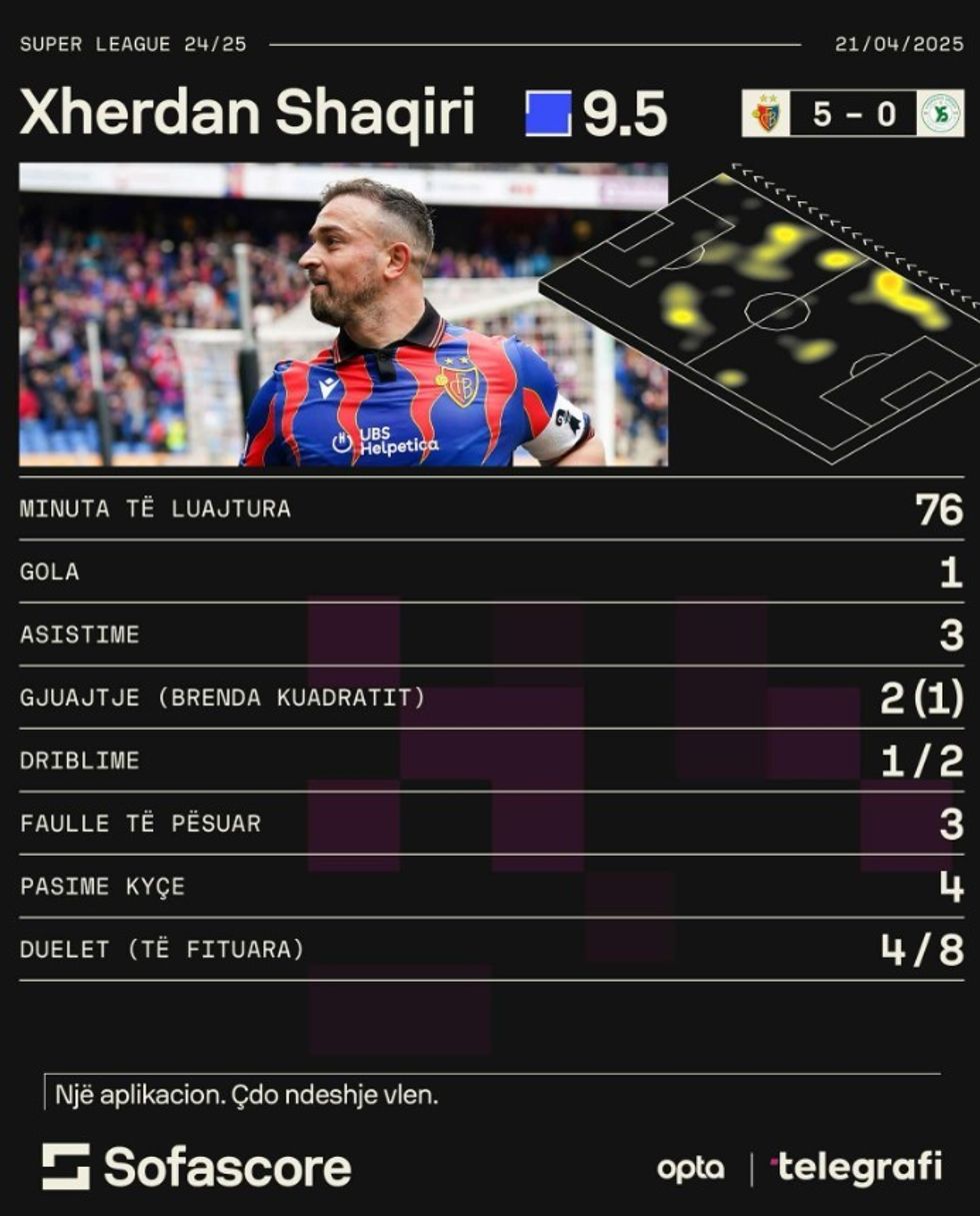 Për këtë paraqitje të jashtëzakonshme, Shaqiri u vlerësua si lojtari më i mirë i ndeshjes nga Sofascore me notën 9.5.