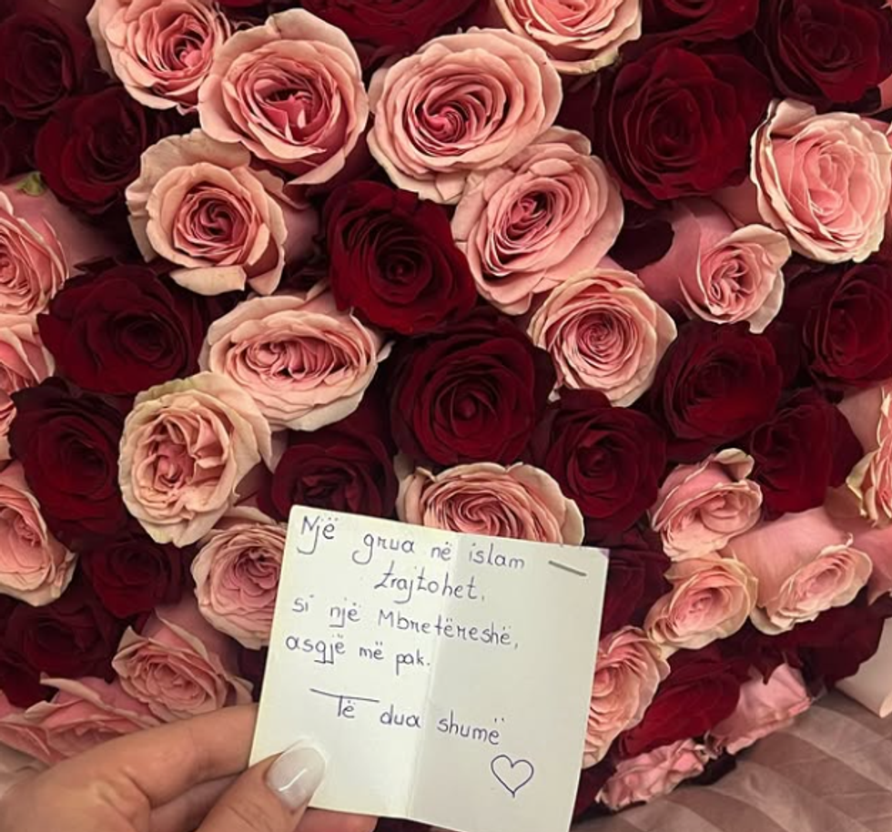 Në një postim të fundit në Instagram, bukuroshja ndau një buqetë të mrekullueshme me trëndafila rozë dhe të kuq, të shoqëruar nga një letër.