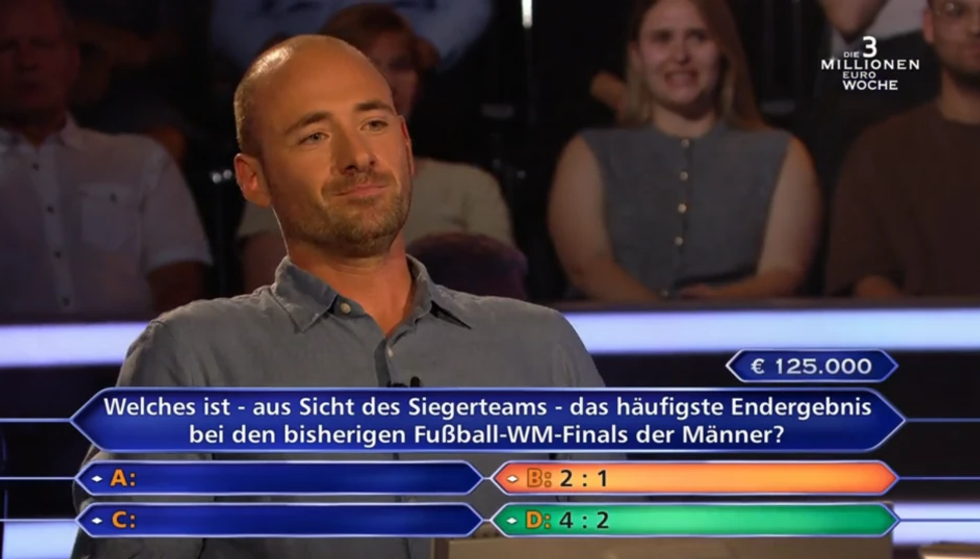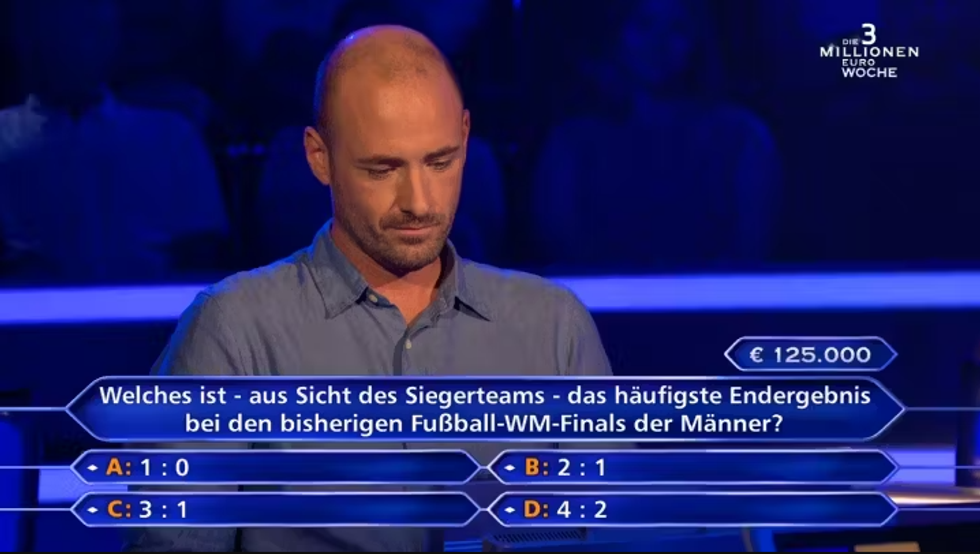 Prezantuesi Günther Jauch sqaroi më pas se përgjigjja e saktë ishte “4:2”, një rezultat që, megjithëse i rrallë, është regjistruar katër herë në historinë e finaleve të Kupës së Botës.