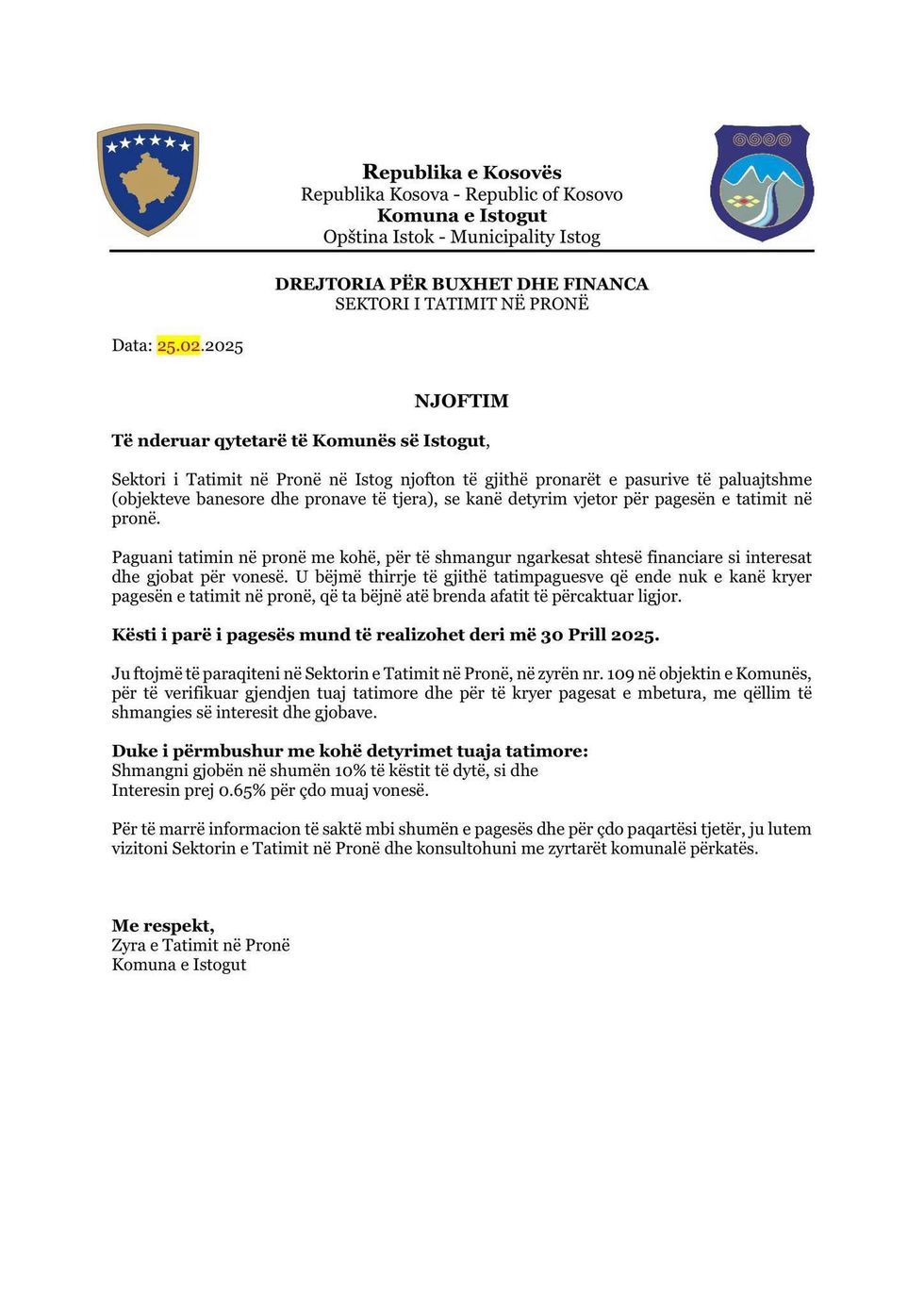 Njoftim nga Komuna e Istogut: Fillon periudha e pagesës së tatimit në pronë