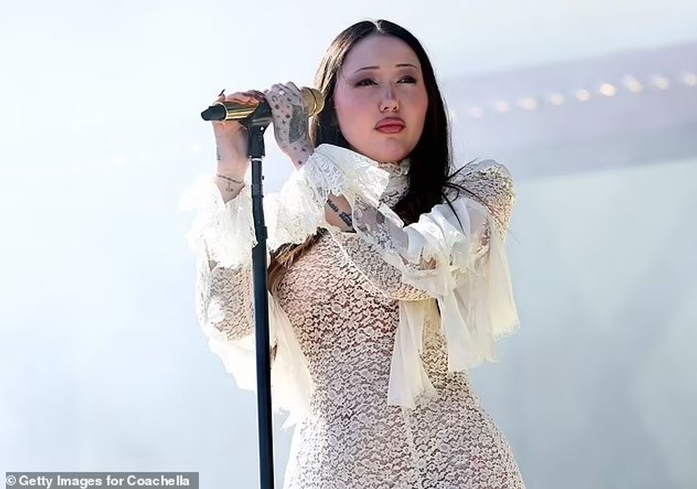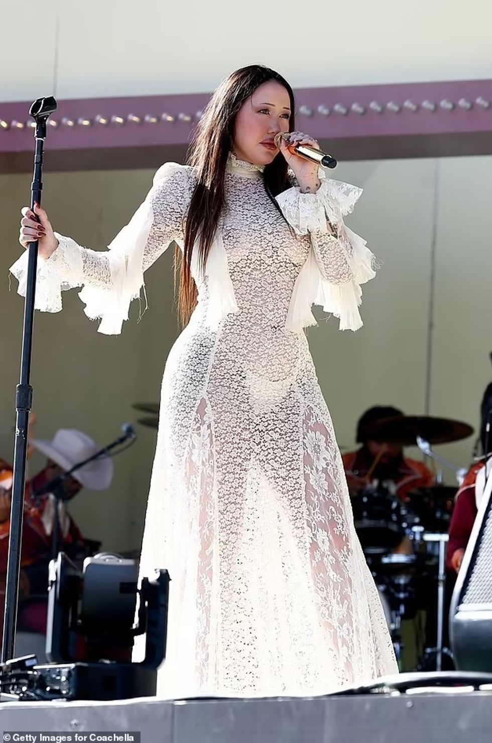 Noah Cyrus tërhoqi vëmendjen në skenën e Coachella këtë të diel, duke u shfaqur pa sytjena nën një fustan të bardhë prej dantelle.