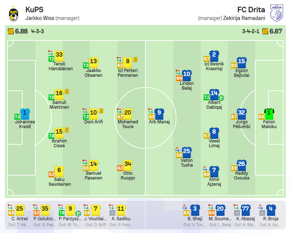 Tek Drita në anën tjetër lojtari më i vlerësuar ishte Albert Dabiqaj i cili u vlerësua me notën 7.3 pas golit të shënuar dhe paraqitjes së mirë në mesfushë.