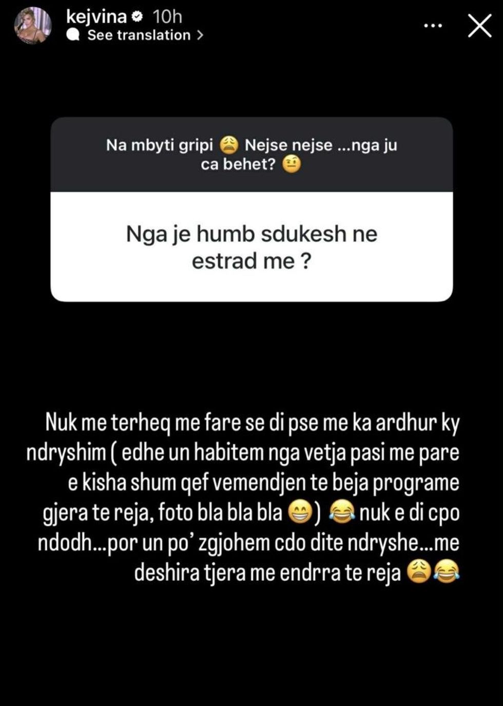 “Nuk më tërheq më fare, se di pse më ka ardhur ky ndryshim (edhe unë habitem nga vetja, pasi më parë e kisha shumë qejf vëmendjen, të bëja programe, gjëra të reja, foto bla bla). Nuk e di ç’po ndodh… por unë po zgjohem çdo ditë ndryshe, me dëshira tjera, me ëndrra të reja”, ka shkruar ajo në përgjigjen e një pyetjeje nga ndjekësit.