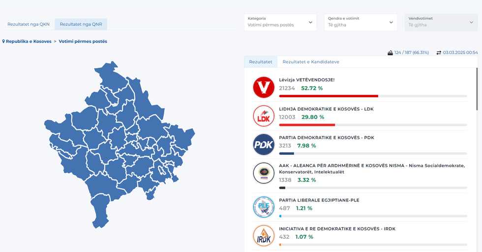 Numërimi i 66.31 për qind e votave me postë – LVV e para në 19 komuna përfshirë edhe ato me shumicë serbe, pasojnë LDK e PDK