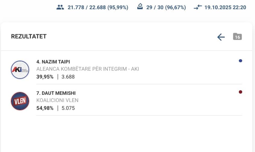 Sipas KSHZ-së, nga 95,99% vota të numëruara, rezultatet janë si më poshtë: