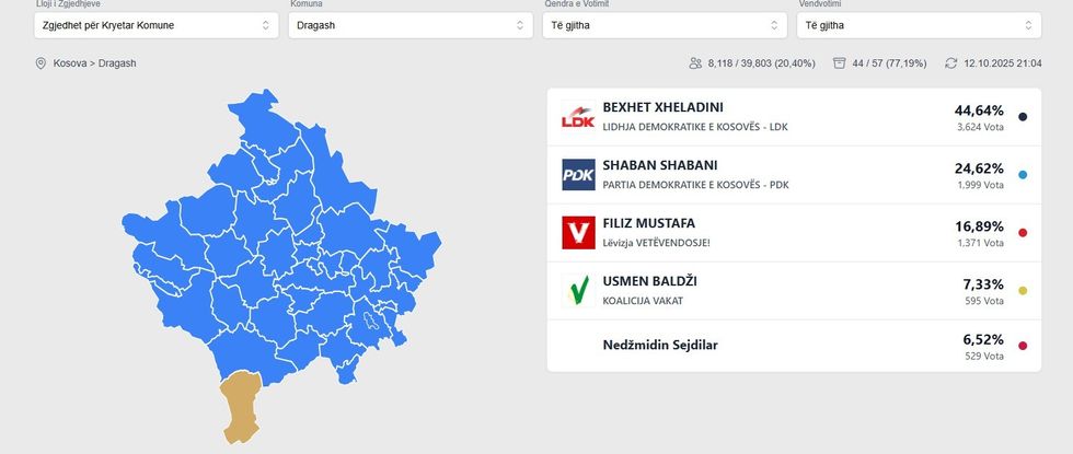 Procesi i numërimit të votave për kryetar të Komunës së Dragashit po shkon drejt fundit. Sipas të dhënave zyrtare të Komisionit Qendror të Zgjedhjeve (KQZ), deri në orën 21:04 janë procesuar 44 nga gjithsej 57 vendvotime, që përbën 77,19% të totalit.