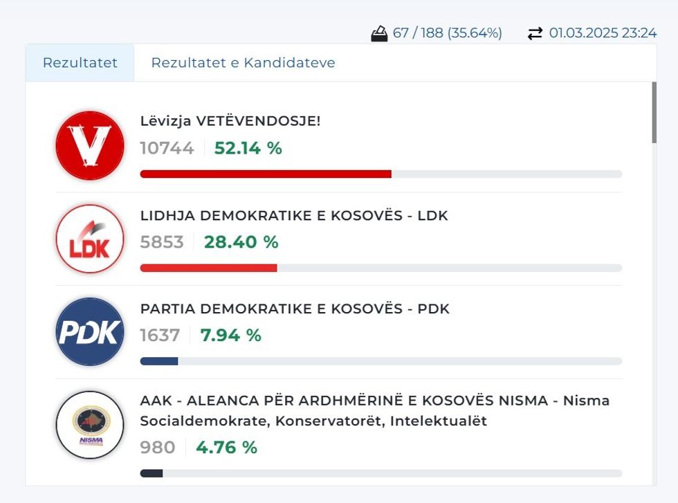 Sipas rezultateve të deritanishme, Lëvizja Vetëvendosje (LVV) kryeson me 52.14% të votave, pasuar nga Lidhja Demokratike e Kosovës (LDK) me 28.40%.