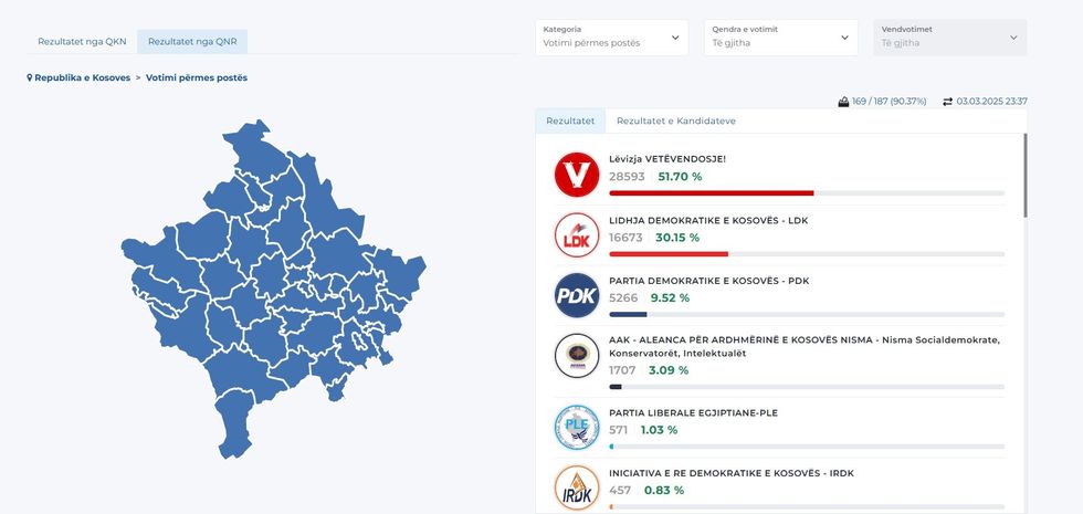 Lëvizja Vetëvendosje ka marr 51.70 për qind të votave, Lidhja Demokratike e Kosovës 30.15 për qind të votave, Partia Demokratike e Kosovës 9.52 për qind, ndërsa Aleanca për Ardhmërinë e Kosovës-NISMA kanë marr 3.09 për qind.