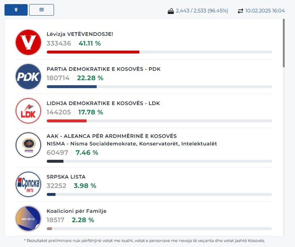 Me tashmë 96.45% të votave të numëruara, Lëvizja Vetëvendosje (LVV) kryeson me 41.11% të votave.