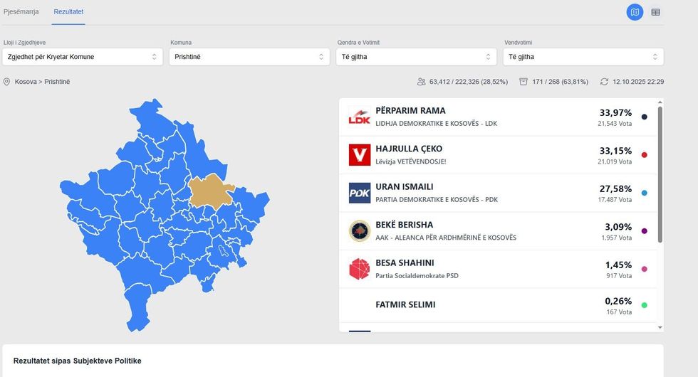 Sipas rezultateve më të fundit të Komisionit Qendror të Zgjedhjeve (KQZ), të publikuara në orën 23:04 të mbrëmjes së 12 tetorit 2025, janë numëruar 218 nga 268 vendvotime, që përbën 81.34% të totalit.