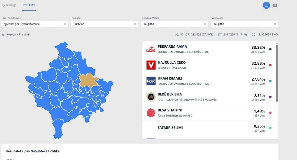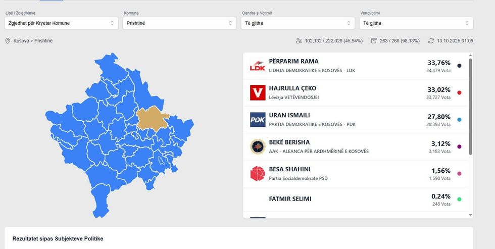 Procesi i numërimit të votave në Komunën e Prishtinës ka përfunduar 99,2% të vendvotimeve (266 nga 268), me 103,326 vota të përpunuara nga 222,326 gjithsej, sipas të dhënave të përditësuara në orën 10:00 të datës 14 tetor 2025.