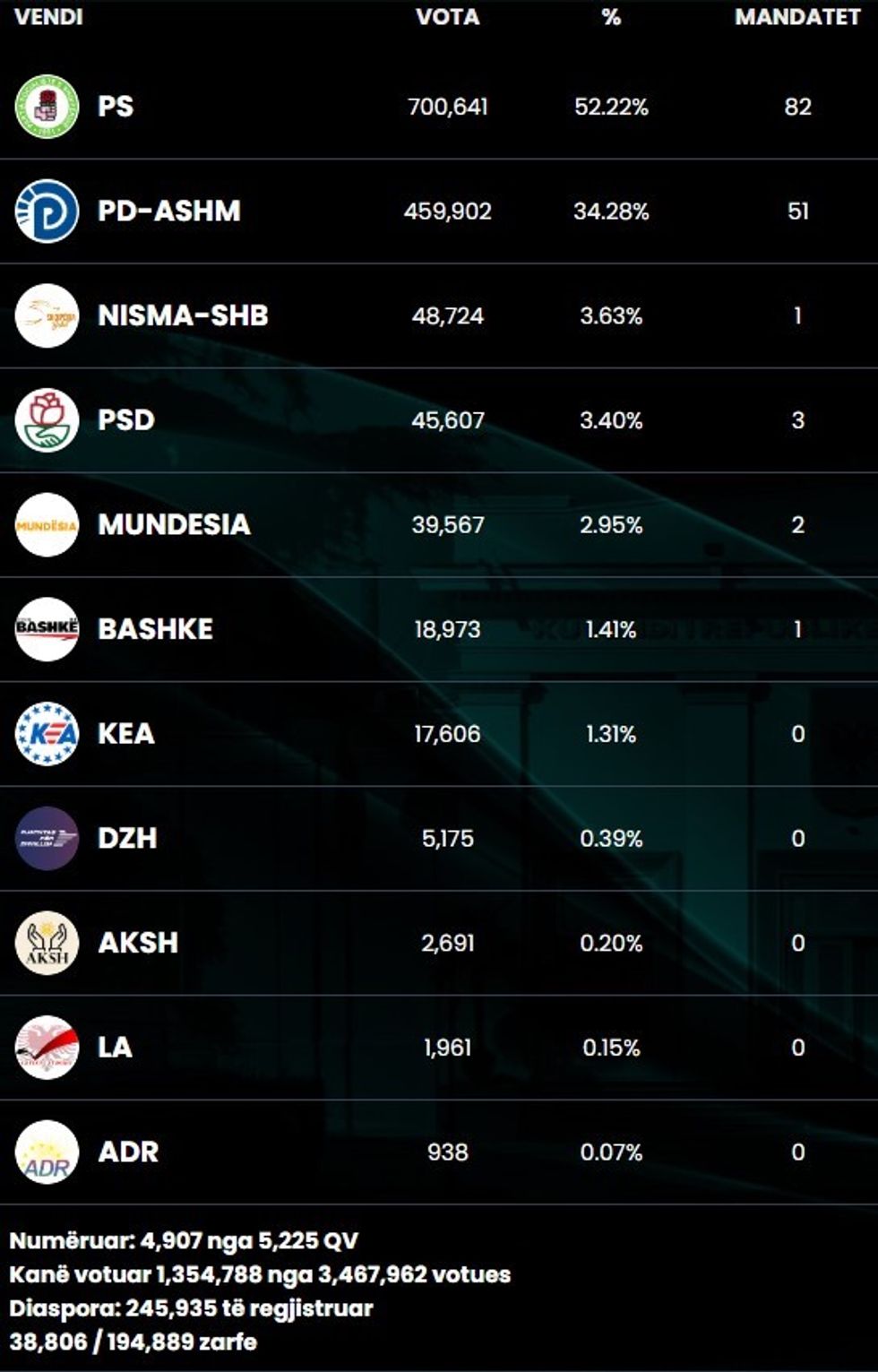 Sipas shifrave zyrtare të raportuara nga Komisioni Qendror i Zgjedhjeve, votat në çdo qark të përkthyera në mandate, japin një tablo ku Partia Socialiste kryeson thellë me numër mandatesh.