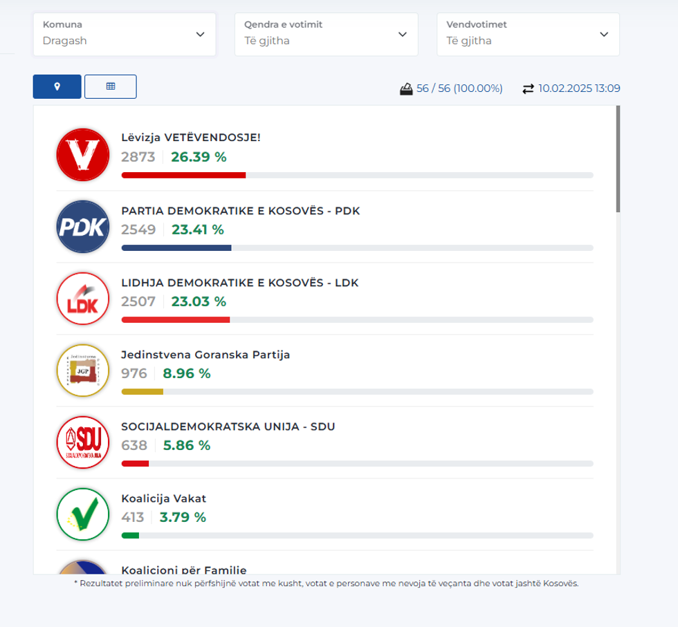 Komuna e Dragashit gjithashtu ka përfunduar numërimin e të gjitha votave. Lëvizja Vetëvendosje edhe në këtë komunë ka arritur të marr rezultat më të lartë.