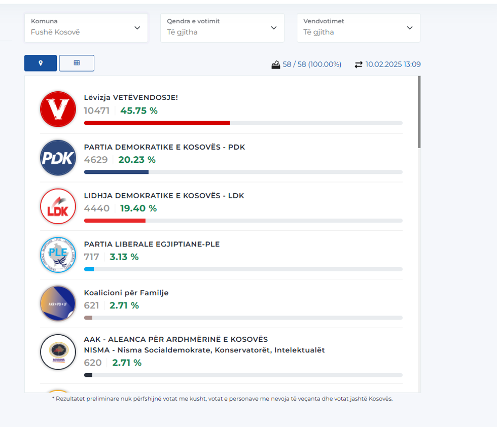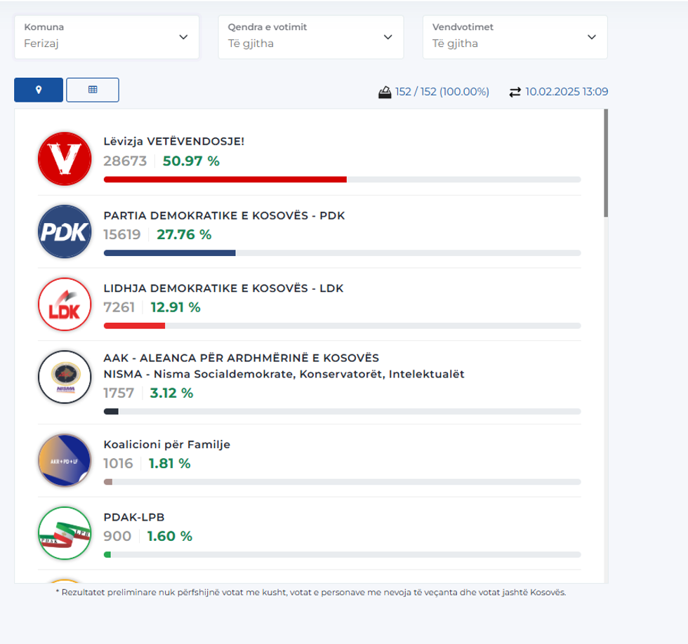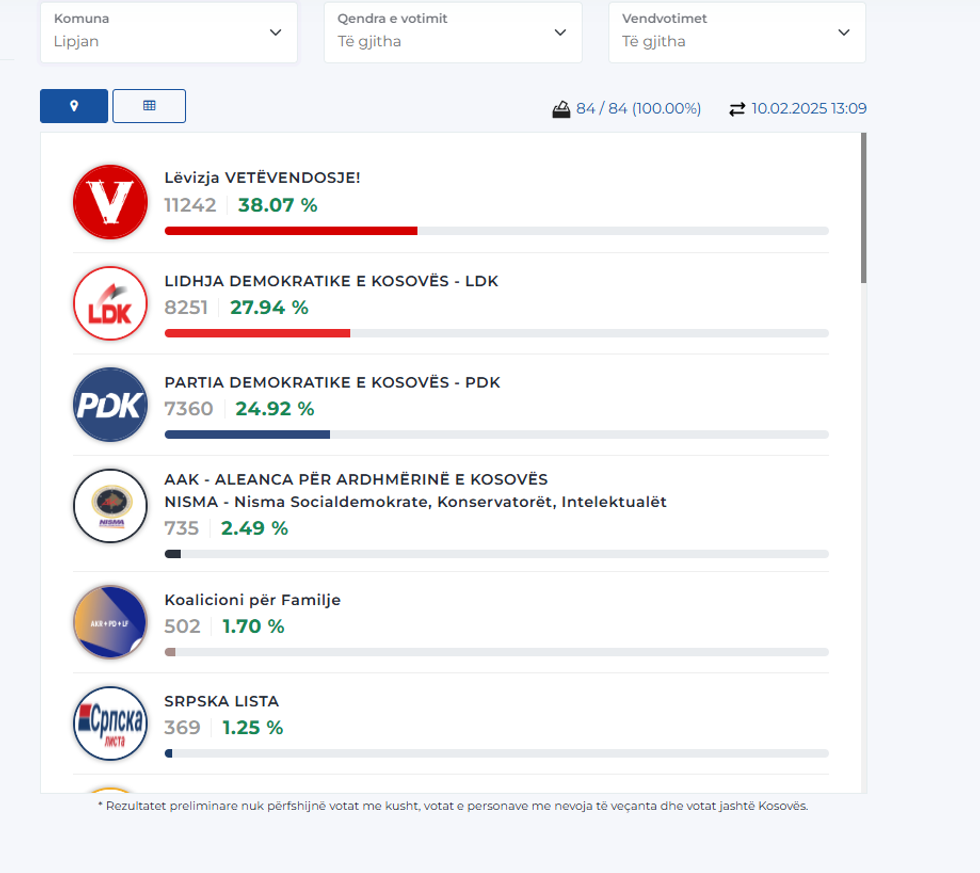 LVV ka marrë 38.07% apo 11 mijë e 242 vota. E dyta është LDK me 27.94% apo 8 mijë e 251 vota.