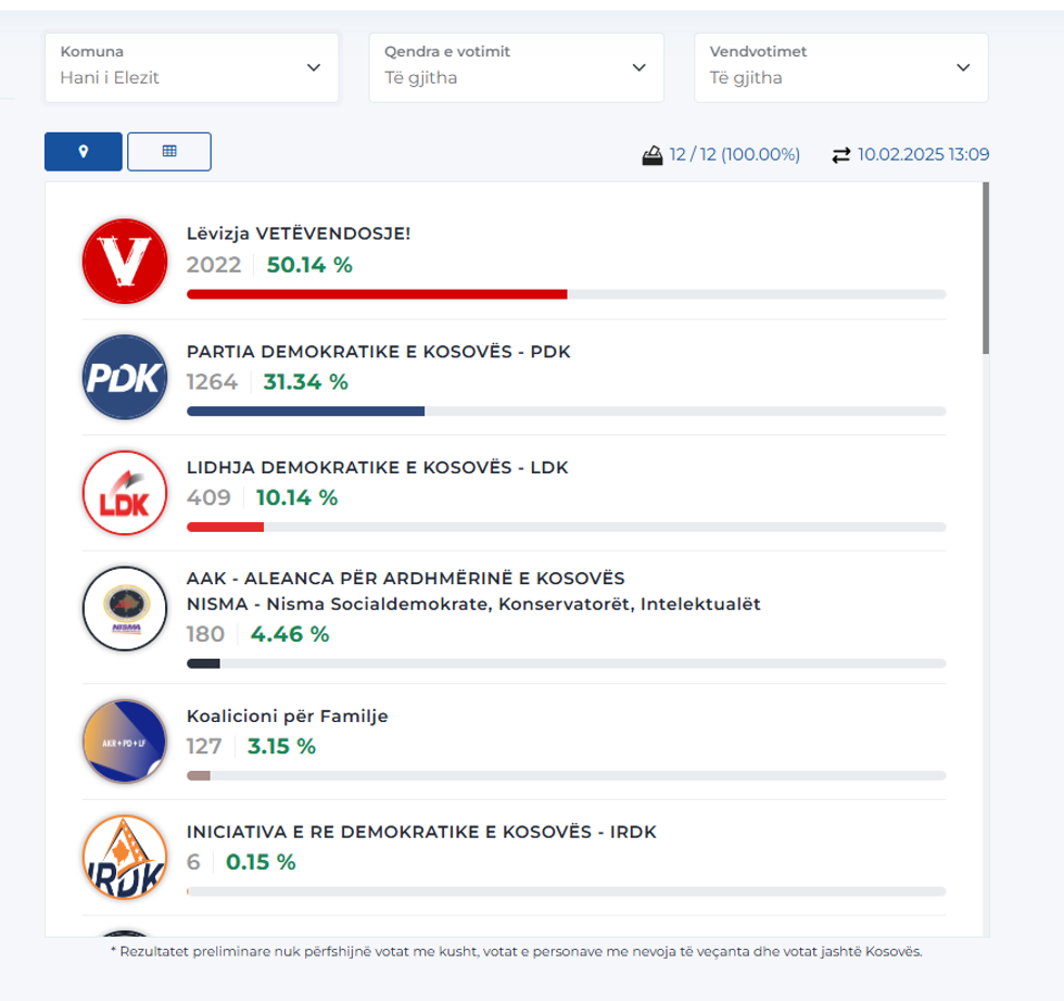 Përfundimi i numërimit të votave ka përfunduar edhe në Han të Elezit. Edhe në këtë komunë LVV prin dukshëm në rezultat në krahasim me partitë tjera.