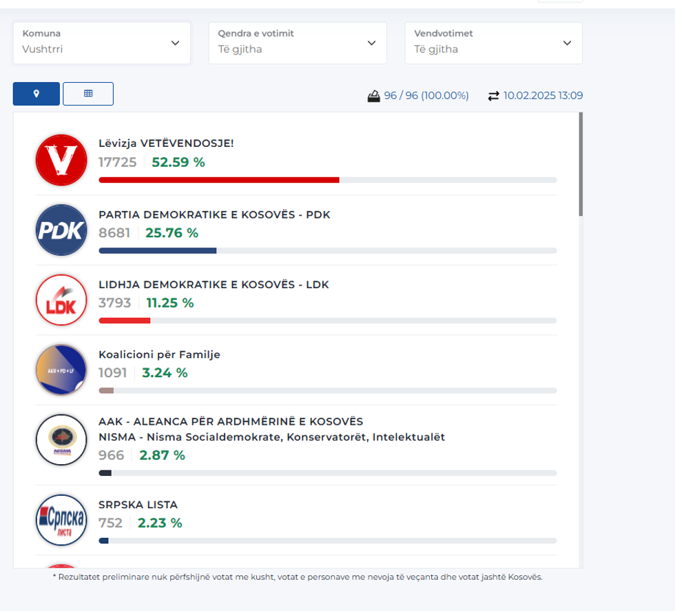 Nga numërimi i votave në 96 vendvotime në qytetin e Vushtrrisë, partia e parë ka dalë LVV me 52.59% apo 17 mijë e 725 vota.