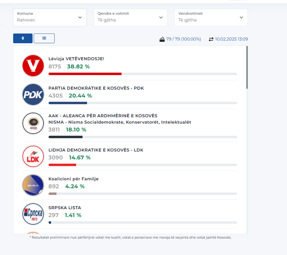 Rahoveci ka përfunduar numrin e të gjitha votave gjithashtu. Sipas rezultateve të publikuara nga KQZ, në këtë komunë LVV është e para me 38.82% apo 8 mijë e 175 vota.