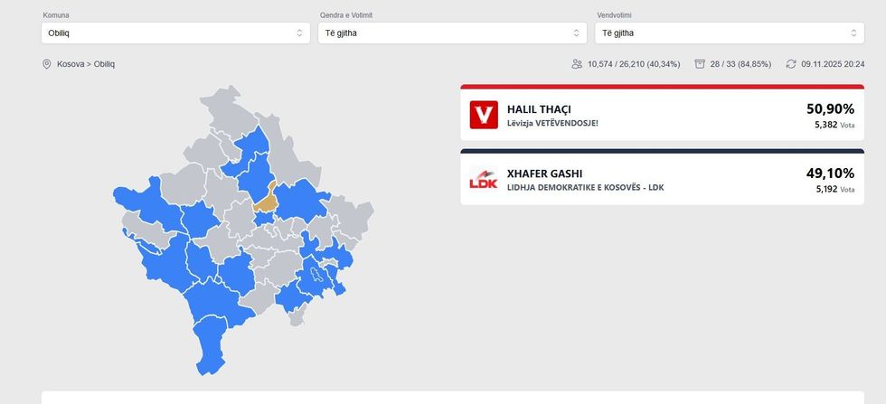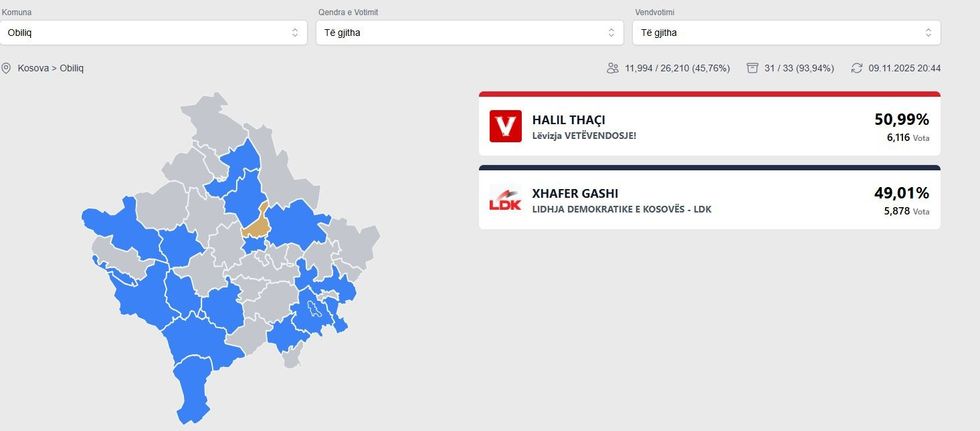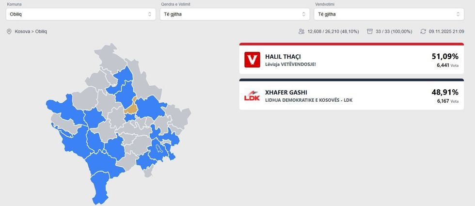 Ndërkaq, Xhafer Gashi i LDK-së ndodhet shumë afër, me pjesën tjetër të votave të numëruara deri më tani, duke e bërë garën në Obiliq një nga më të ngushtat e këtij raundi zgjedhor.