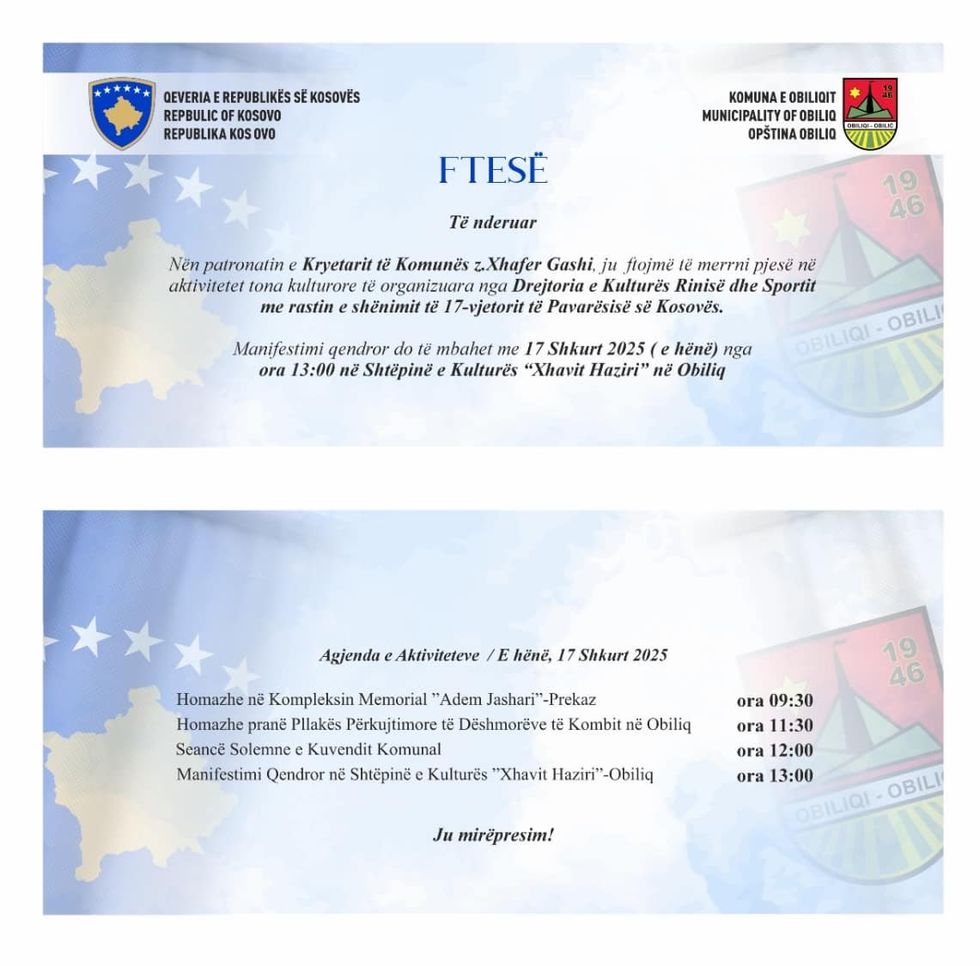 Komuna e Obiliqit ka publikuar agjendën e aktiviteteve kulturore-artistike për nder të 17-vjetorit të Pavarësisë së Republikës së Kosovës.