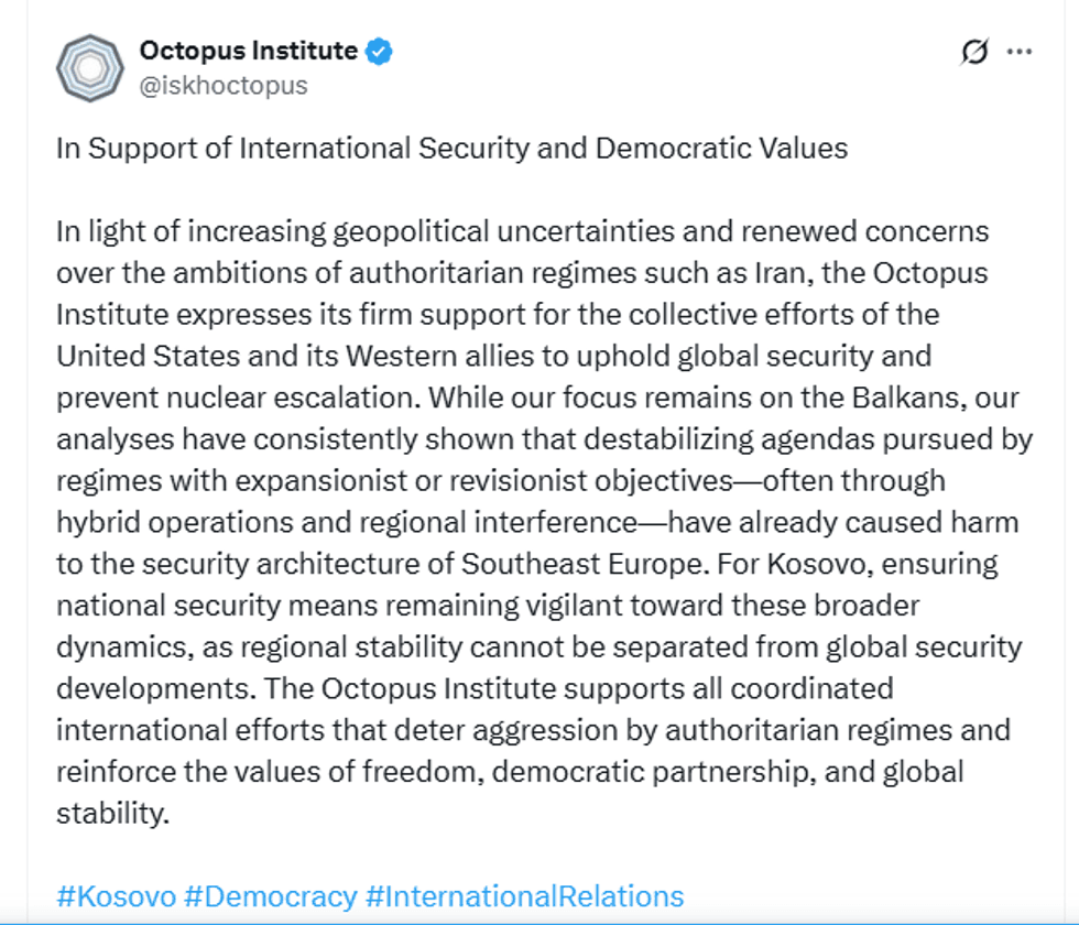 Instituti për Studime të Luftës Hibride “Octopus”ka mbështetur veprimet e koordinuara ndërkombëtare kundër përshkallëzimit bërthamor dhe ambicieve destabilizuese të regjimeve autoritare si Irani.