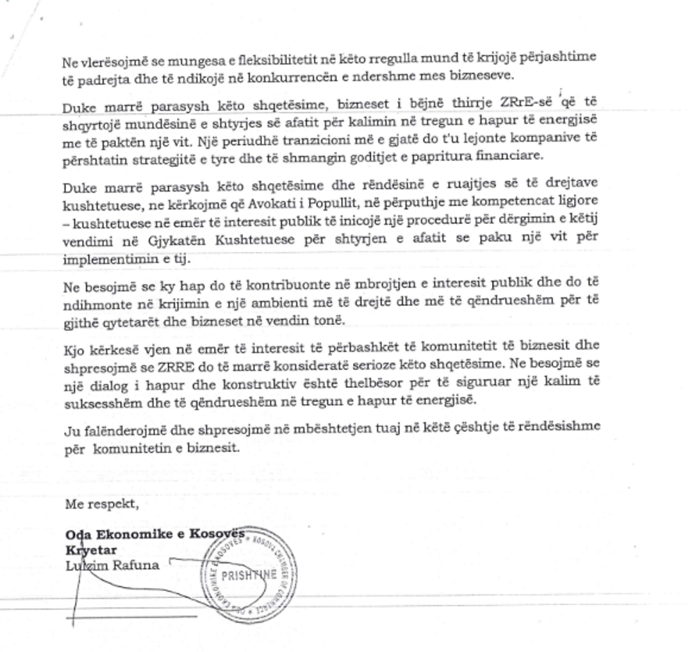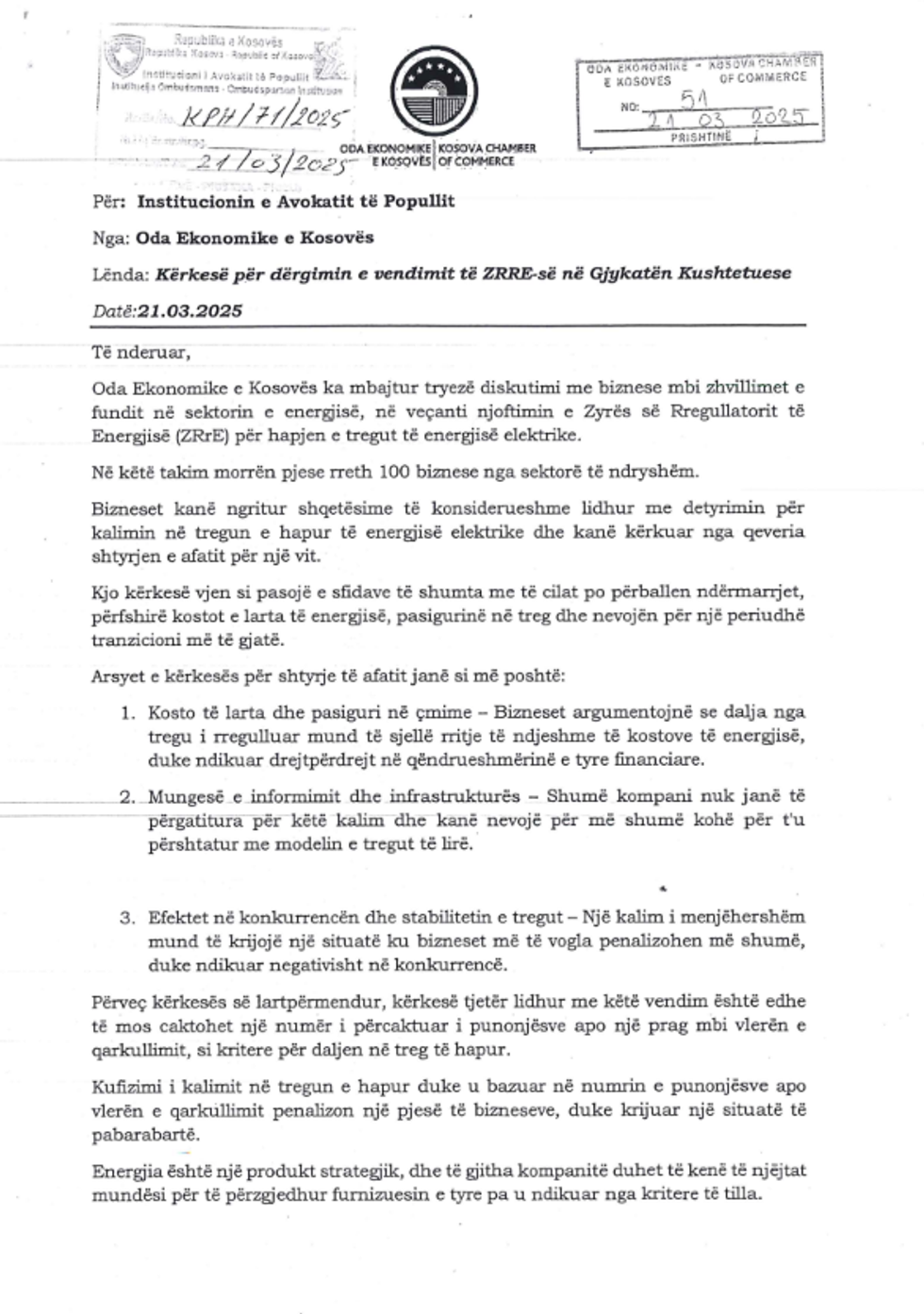 Oda Ekonomike e Kosovës i është drejtuar Avokatit të Popullit me kërkesë për të iniciuar në Gjykatën Kushtetuese, që të pezulloi vendimin e Zyrës së Rregullatorit të Energjisë (ZRrE) lidhur me