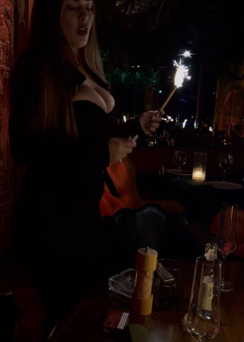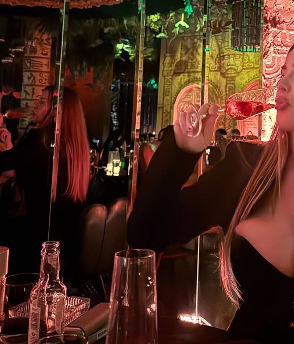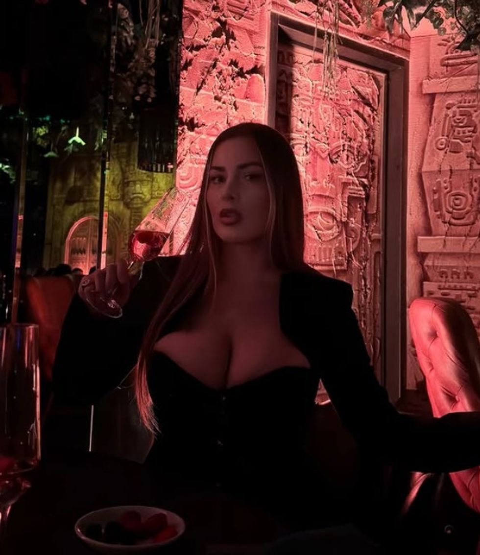 Në një ambient luksoz me ndriçim të ngrohtë dhe atmosferë mistike, Olta është fotografuar duke shijuar një gotë verë, ndërsa rrezaton elegancë dhe vetëbesim.