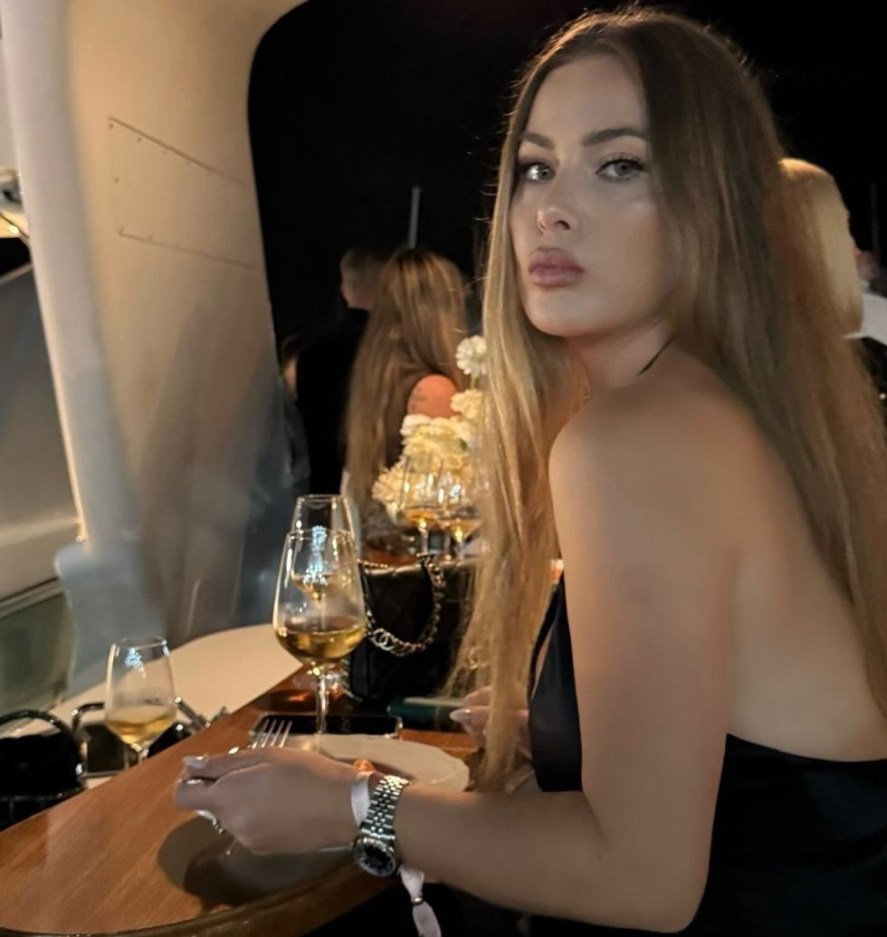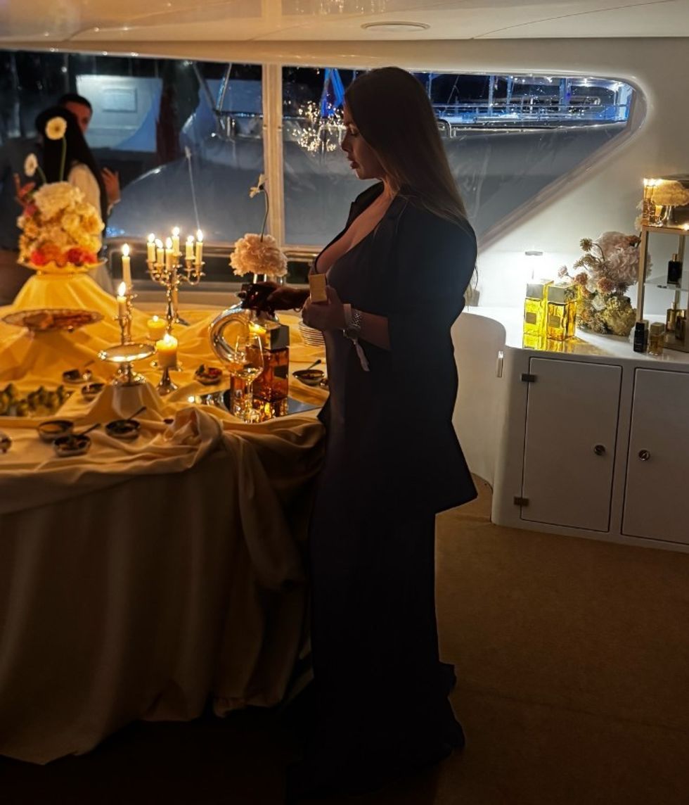 Fotografitë e realizuara në një jaht dhe në ambiente festive tregojnë një atmosferë plot shkëlqim, me ndriçime të ngrohta, gota shampanje dhe dekor luksoz që reflektojnë stilin jetësor glamuroz të Olta Gixharit.