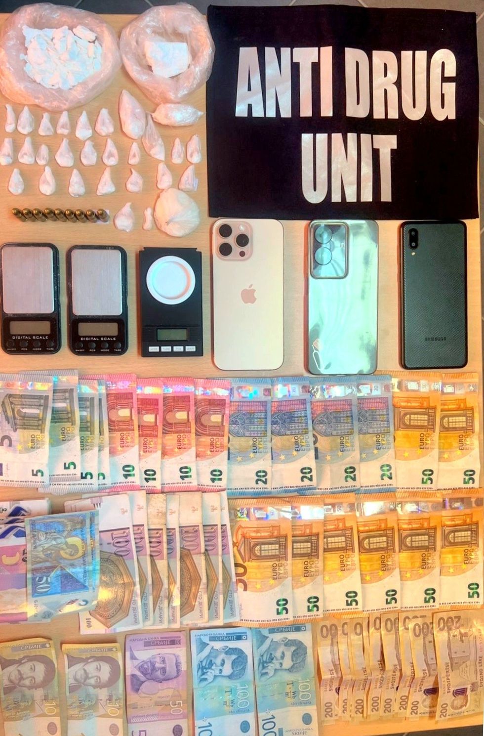 "Kështu, dje me 30.04.2025, rreth mesditës, ka filluar operacioni policor ‘Dritarja’ në kapje të të dyshuarve. Fillimisht është arrestuar i dyshuari A.A., (viti i lindjes 1983, mashkull kosovar), të cilit i janë gjetur 0.44 gr substancë që dyshohet të jetë kokainë. Pastaj, hetuesit e DHTN-së, të mbështetur nga Njësia e Reagimit të Shpejtë, kanë kryer kontrolle në një shtëpi, ku janë gjetur dhe sekuestruar provat: rreth 56.9 gr substancë narkotike që dyshohet të jetë kokainë, para (euro dhe valuta të shteteve të ndryshme) dhe dëshmi tjera që do të përdorën në procedurë të mëtejme gjyqësore", thuhet në njoftimin e policisë.