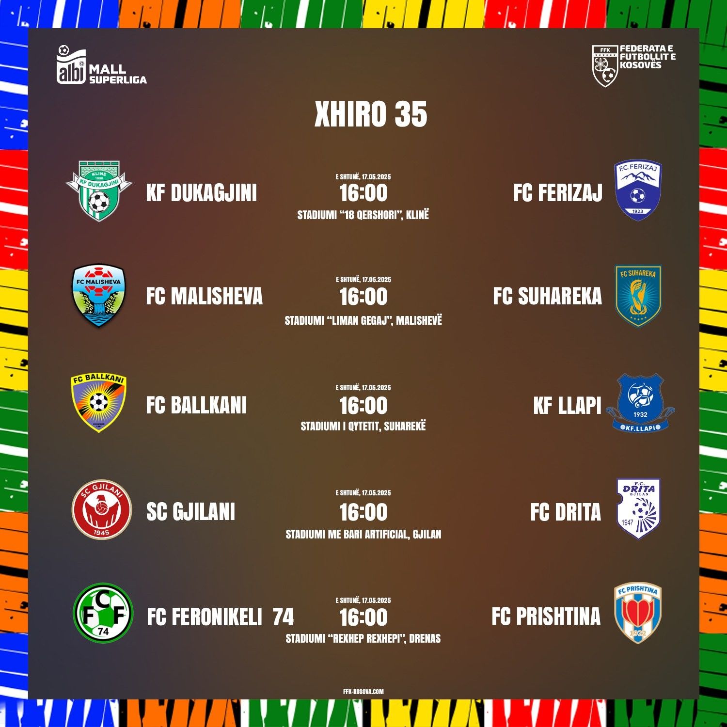 Federata e Futbollit të Kosovës (FFK), ka publikuar edhe orarin e xhiros së 35-të ku të gjitha ndeshjet do të zhvillohen në të njëjtën kohë.