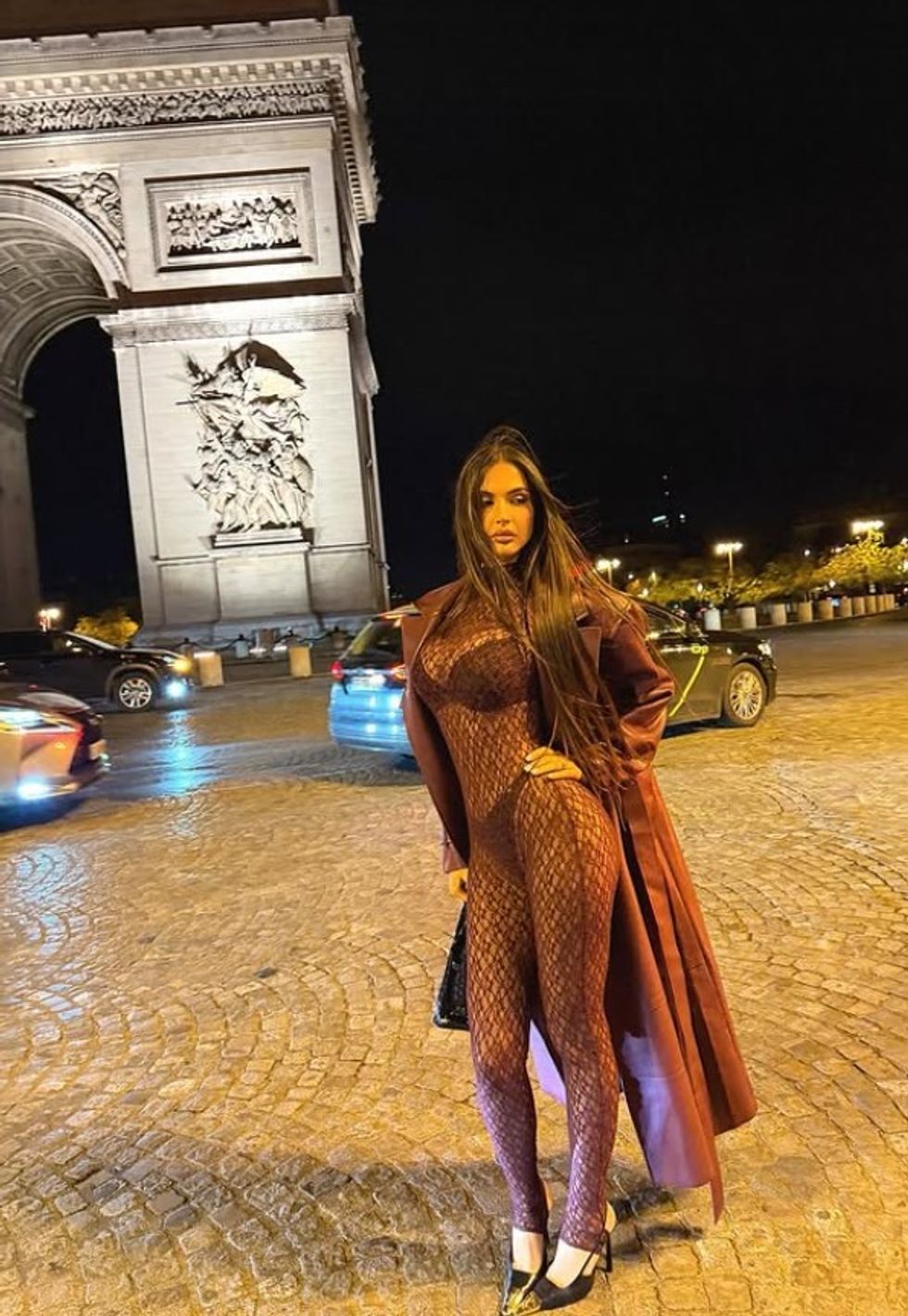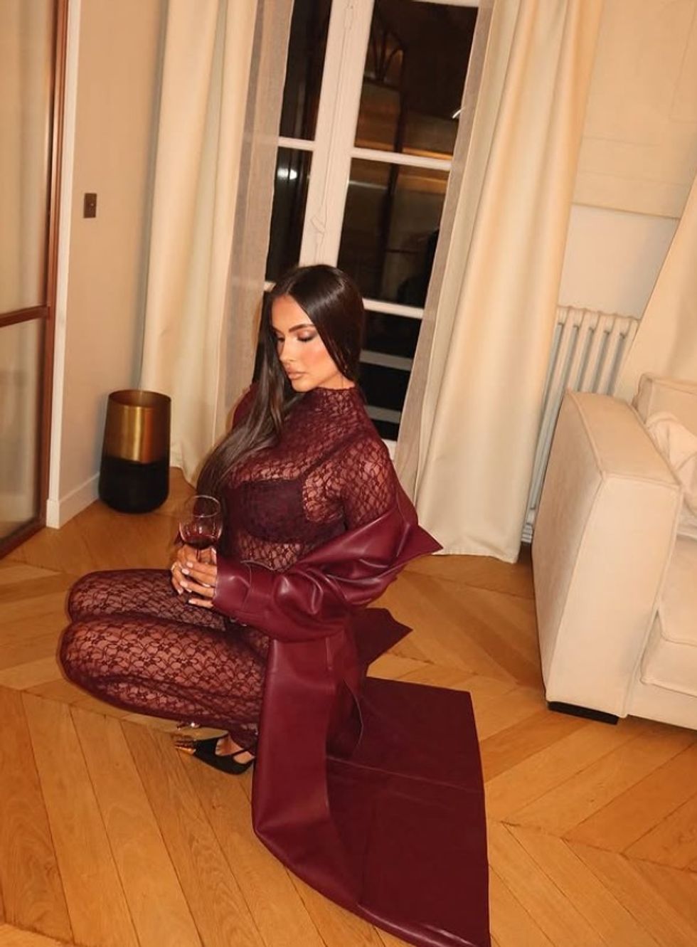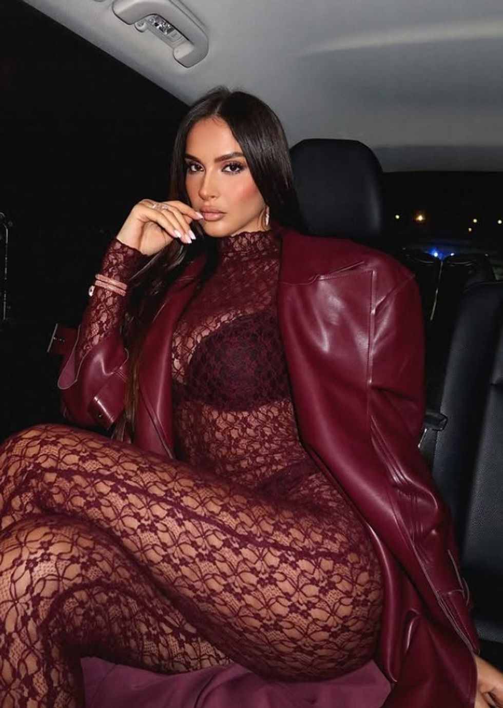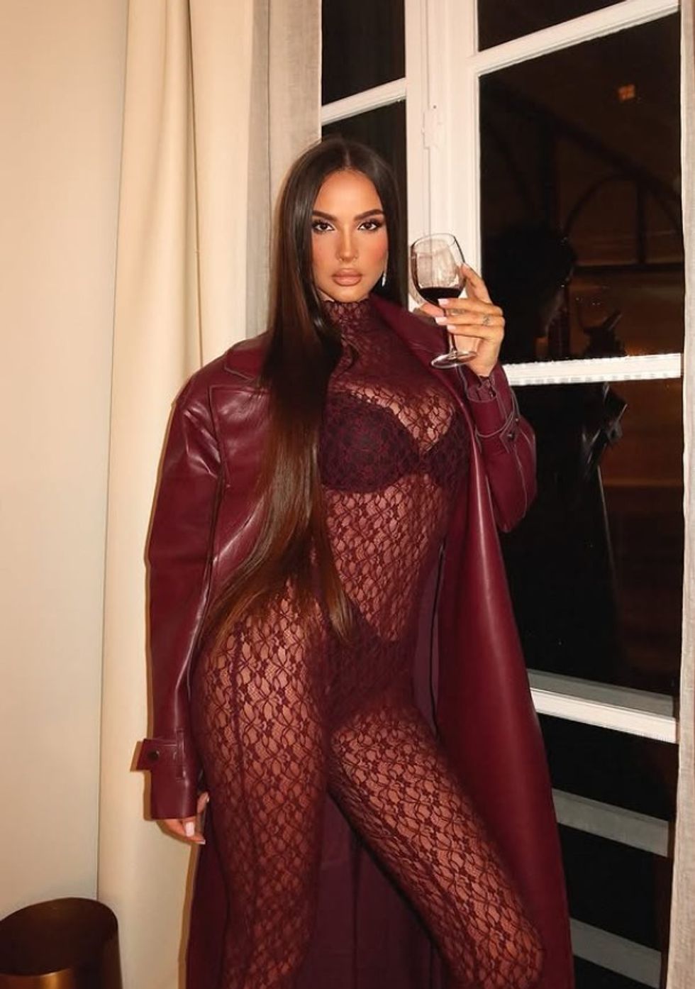 Ajo ka publikuar një set fotografish ku shfaqet e veshur me një kostum transparent në ngjyrë vishnje, të kombinuar me një mantel të gjatë lëkure në të njëjtën ngjyrë.